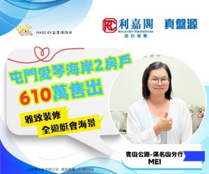 利嘉閣地產青山公路-滿名山分行經理黃錦鵬(Benson)表示,該行高級客戶經理郭美儀(Mei)最新促成屯門愛琴海岸7座高層C室的二手成交個案,單位實用面積約549方呎,屬2房間隔,向南,外望全海景。