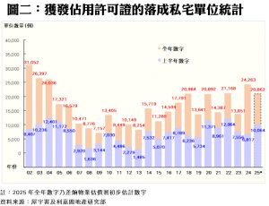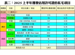 此外,私人住宅落成量方面,根據屋宇署今日最新發表的資料月報顯示,2025年六月份全港共有8個項目,合共2,637個私人住宅單位落成(以屋宇署發出佔用許可證的樓宇數量為準),較五月份的330伙大增7倍;至於今年上半年累計共10,064伙私宅落成,較去年同期的7,097伙增加近42%,為三年同期最多。