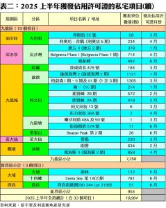 根據資料顯示,六月份本港共有8個私宅項目正式落成,當中規模最大的是大埔十四鄉「Sierra Sea第1A(2)期」,涉及781伙;其次為黃竹坑港島南岸3B期「Blue Coast」,涉及642伙;至於,同區3C期「Blue Coast II」(558伙)、長沙灣「曉柏峰」(492伙)、西營盤「東邊街九號」(76伙)、西貢南邊圍(DD 244 Lot 2189) (51伙)、畢架山「Beacon Peak 第2期」(26伙)及九龍塘衙前圍道57A號(11伙)亦於期內竣工(詳見表二)。