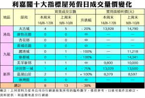 利嘉閣地產總裁廖偉強稱,周日天氣不穩,加上一手新盤搶攻市場佔有率,二手業主則相對惜售,令周末十大屋苑交投稍放緩。綜合利嘉閣地產分行網絡數據,在過去的周末(8月16至17日)十大指標屋苑錄得8宗二手成交,較對上一個周末(8月9至10日)的13宗,按周減少38%,重回前周及七月中下旬的個位數水平。