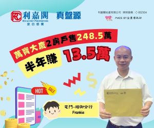 據悉,原業主於今年3月以約235萬元買入單位,持貨不足半年,帳面獲利13.5萬元。