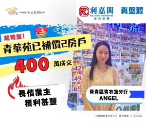 利嘉閣地產葵青區青衣站分行聯席董事梁均耀(Wilson)表示,該行高級客戶董事黃燕芳(Angel)最新促成青衣青華苑B座中層6室的二手成交個案,單位實用面積約438方呎,屬2房間隔,望市景。