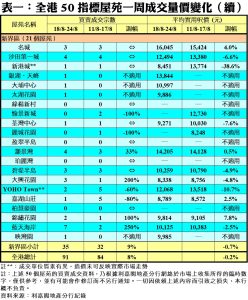 至於,港島區8個指標屋苑上周共錄8宗買賣,較前周的17宗減少53%,其中康怡花園南豐新村各錄1宗交投,按周分別減少67%及75%;藍籌屋苑太古城交投量由前周的6宗,減少50%至上周的3宗。此外,在全港50個指標屋苑之中,上周共有14個屋苑錄得「零成交」,較前周的13個增加8%,當中九龍區及新界區分別佔6個屋苑,港島區則佔2個(詳見表一)。