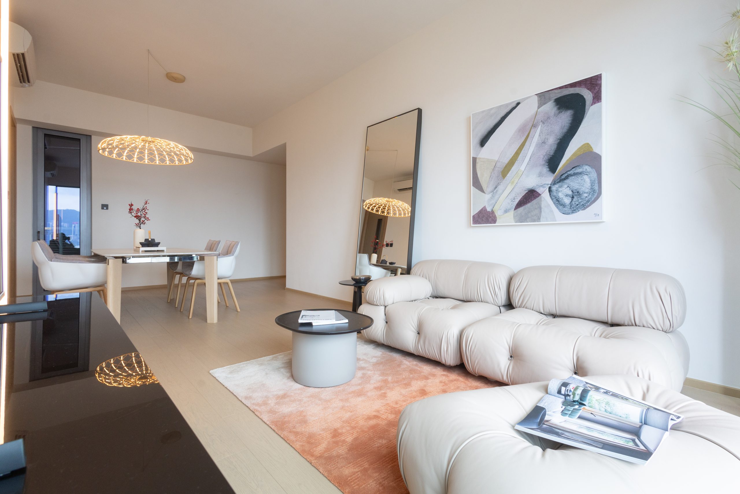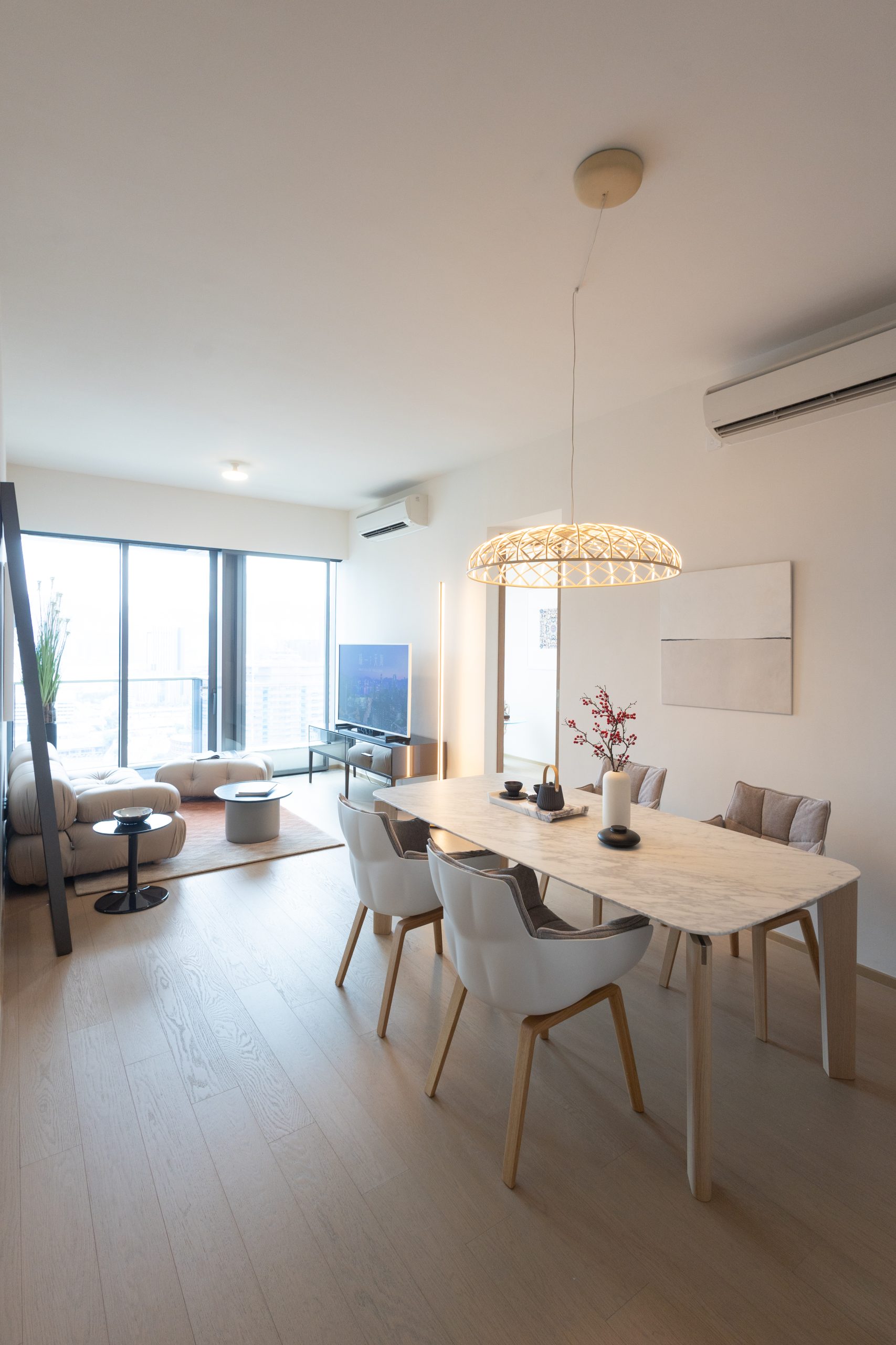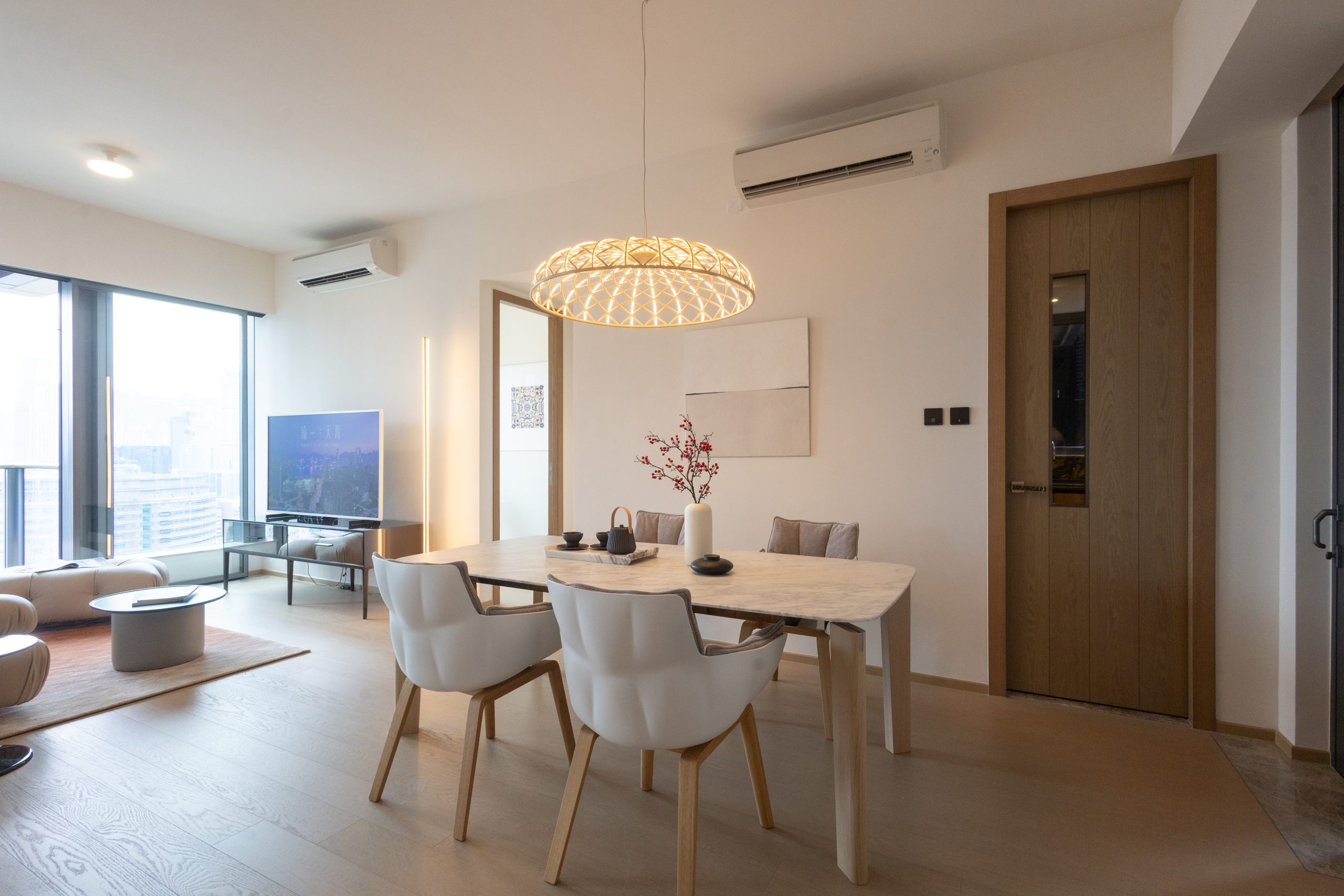 飯廳選用比利時建築師Vincent Van Duysen設計的白色雲石枱面的長枱及西班牙設計師Patricia Urquiola設計的淺灰色以方格縫線為亮點的餐椅,打造現代低調奢華居所;客飯廳朝南,連約27方呎露台配以落地玻璃趟門,長逾7.2米、闊約3.25米的長 形客飯廳光線充足,間隔寬敞實用,層與層之間高度約 3.225米,空間感十足;大門配備Philips智能電子門鎖,設有多種開鎖方式,包括密碼鍵盤、加密門卡和生物辨識指紋感應等,亦可隨時隨地為特定訪客設立臨時密碼或預設一次性密碼等多種開鎖方法,方便住客需要。