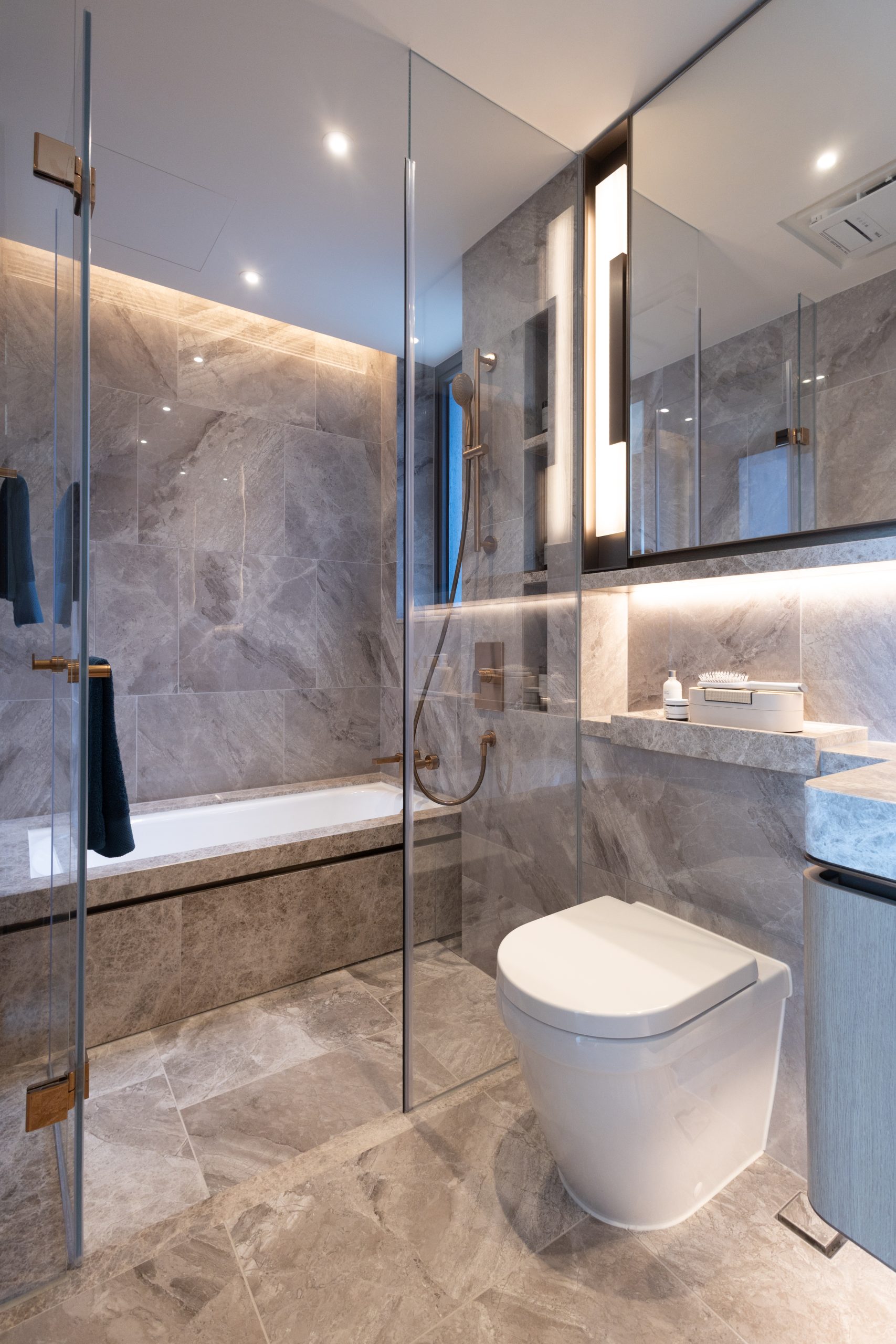 主人套房與客廳、娛樂室及書房同向,享維港海景,並全數選用B&B Italia 品牌傢具,貫徹單位整體風格。主人大床Husk Bed由西班牙設計師Patricia Urquiola設計,床頭板利用高背包圍式的方格縫線設計,體現B&B Italia標誌性的幾何分割,突顯住戶的個性一面,雙人大床配上雙邊床頭櫃仍能輕鬆做到三邊落床,盡顯大宅氣派;睡房亦已預留衣櫃位,現放置由意大利設計師 Antonio Citterio打造的精緻貯物櫃,鮮明綫條糅合鏡面面板,視覺通透,為房間增添優雅和質感。主人浴室及浴室均採用明廁設計,增加採光度及有助空氣流通,打造舒適健康的悠然生活,並嚴選仿雲石紋理瓷磚打造牆身及地台,配備一系列國際品牌浴室設備,如德國品牌 Villeroy & Boch座廁和洗手盆,以及意大利品牌Gessi洗手盆水龍頭和花灑套裝;主人浴室別具氣派,設有淋浴間及配備德國品牌Bette浴缸,讓戶主享有更優質的私人空間。