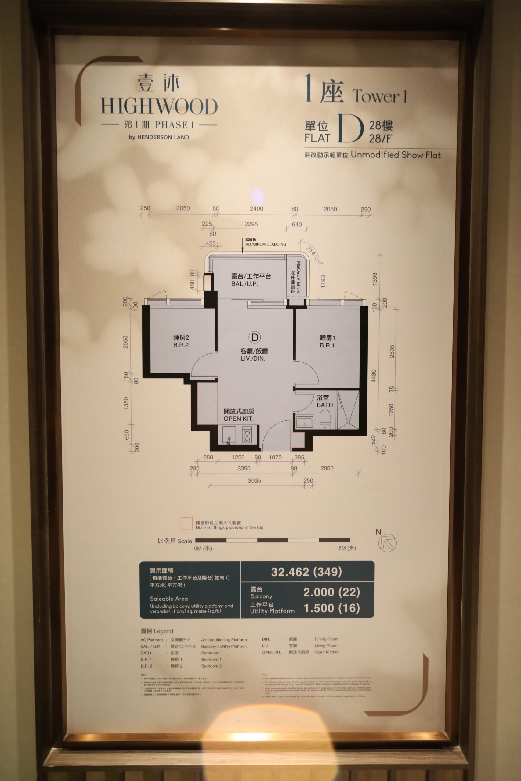 實用面積349方呎連22方呎露台,為兩房開放式廚房間隔,兩間睡房分布於客飯廳兩旁,並與客廳同向。
