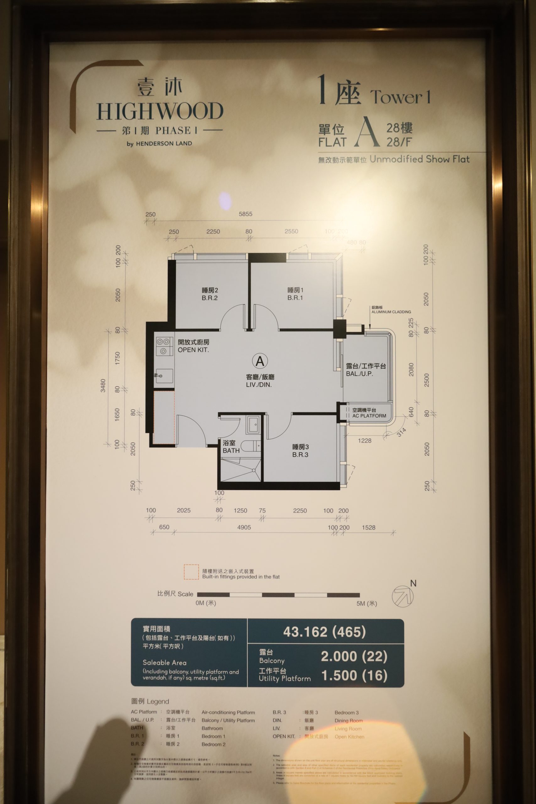 實用面積465方呎連22方呎露台,為三房開放式廚房間隔,客飯廳連接露台及工作平台,其中一個睡房玻璃窗為L型設計。