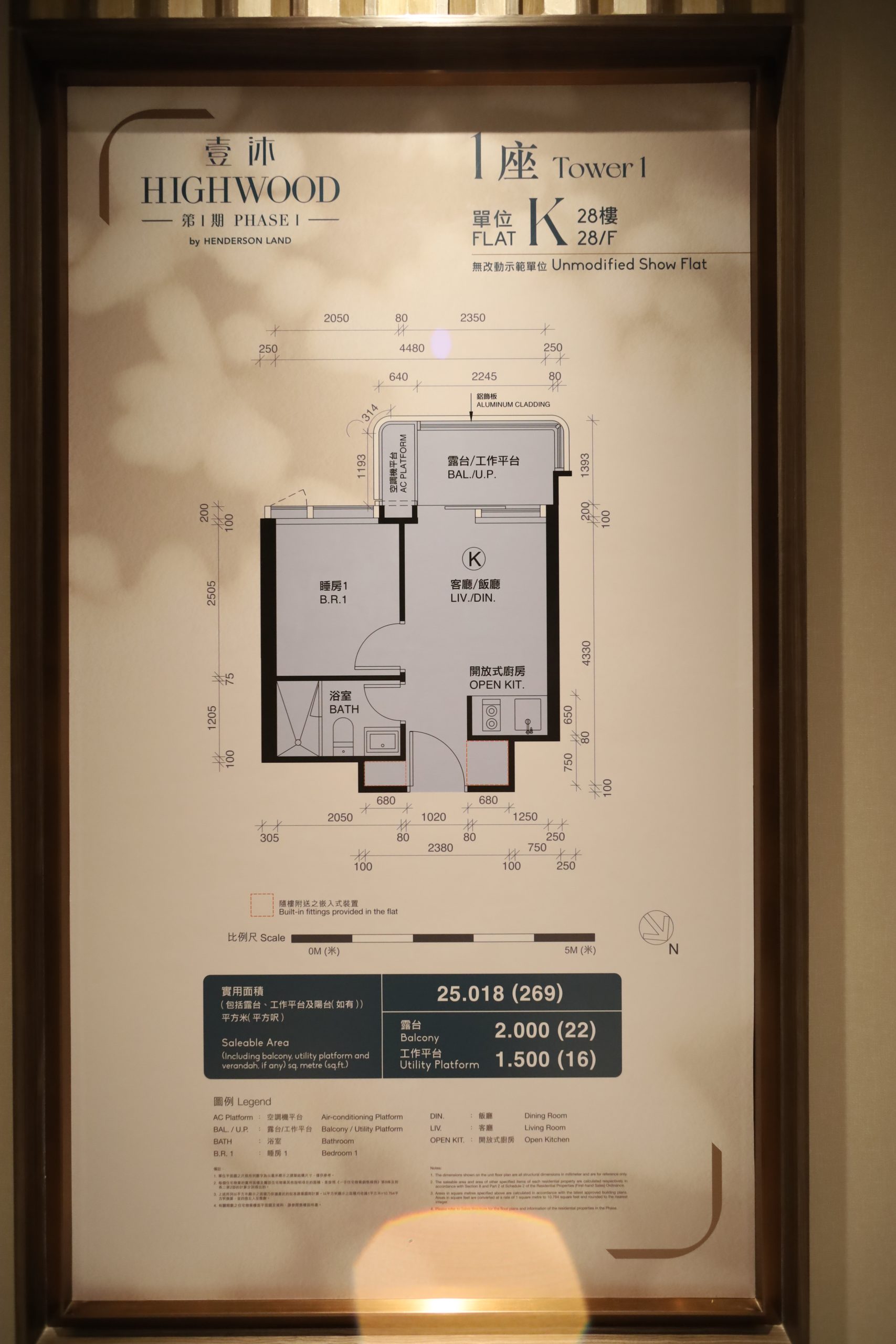 實用面積269方呎連22方呎露台,為一房開放式廚房間隔,間隔方正,客飯廳連接露台及工作平台,房間與客廳景觀同向。