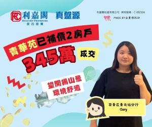 梁氏表示,新買家為區內客,於青衣尋覓2房單位,經利嘉閣真盤源平台見上址放盤,即相約睇樓。客人認為單位企理,景觀開揚,遂拍板購入。業主原叫價405萬元(已補地價),見買家有誠意,議價後以市價345萬元(已補地價)成交,折合實用面積呎價約8,603元。