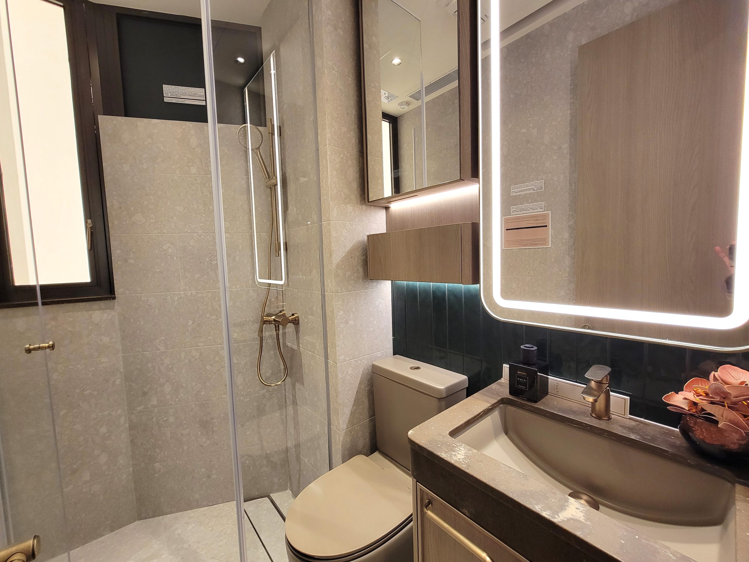 主人睡房設計以前衛風格為主軸,巧妙彰顯型格生活品味,延續高樓底的空間優勢,營造出開揚而舒適的居住氛圍。主人睡房規劃細緻,儲物空間、梳妝檯、掛衣區及工作書檯一應俱全,每寸空間都匠心獨運。設計不僅滿足日常所需,更可以流露出住客對生活美學的非凡品味。房內的L型特大窗戶設計,亦能引入充沛自然光,將戶外開揚景致盡收眼底,打造一處兼具美學與機能的私密空間。主人房浴室及浴室均精心採用明廁設計,提供良好的自然通風及充足 的自然採光。浴室設有多功能鏡櫃MIRROR+,採用雙插座設計,提供USB和電源插座,更預留空間放置風筒等小型家電用品,貼心照顧住戶所需。面盆櫃為拉出式儲物空間,可妥善收納日常浴室用品。