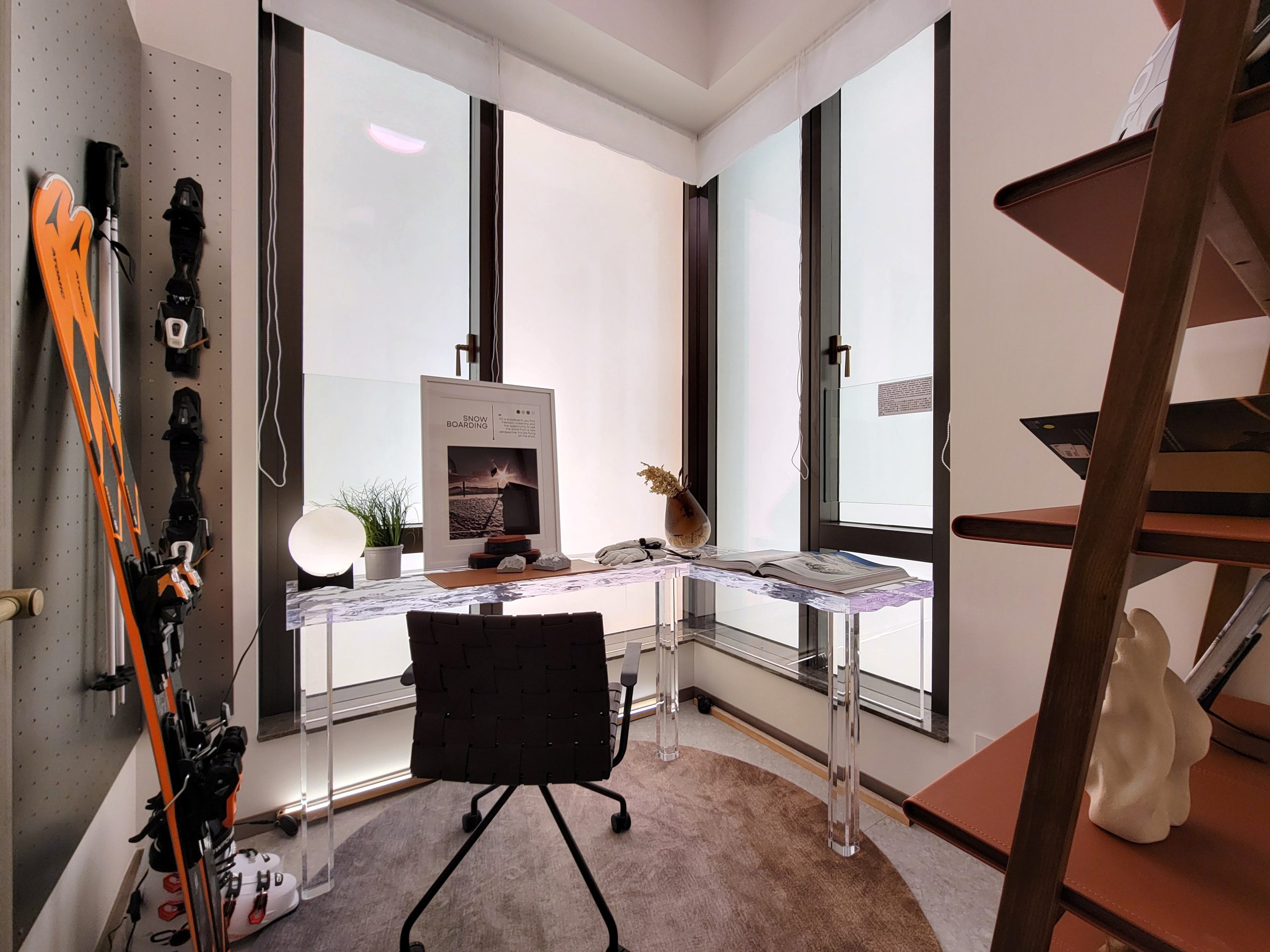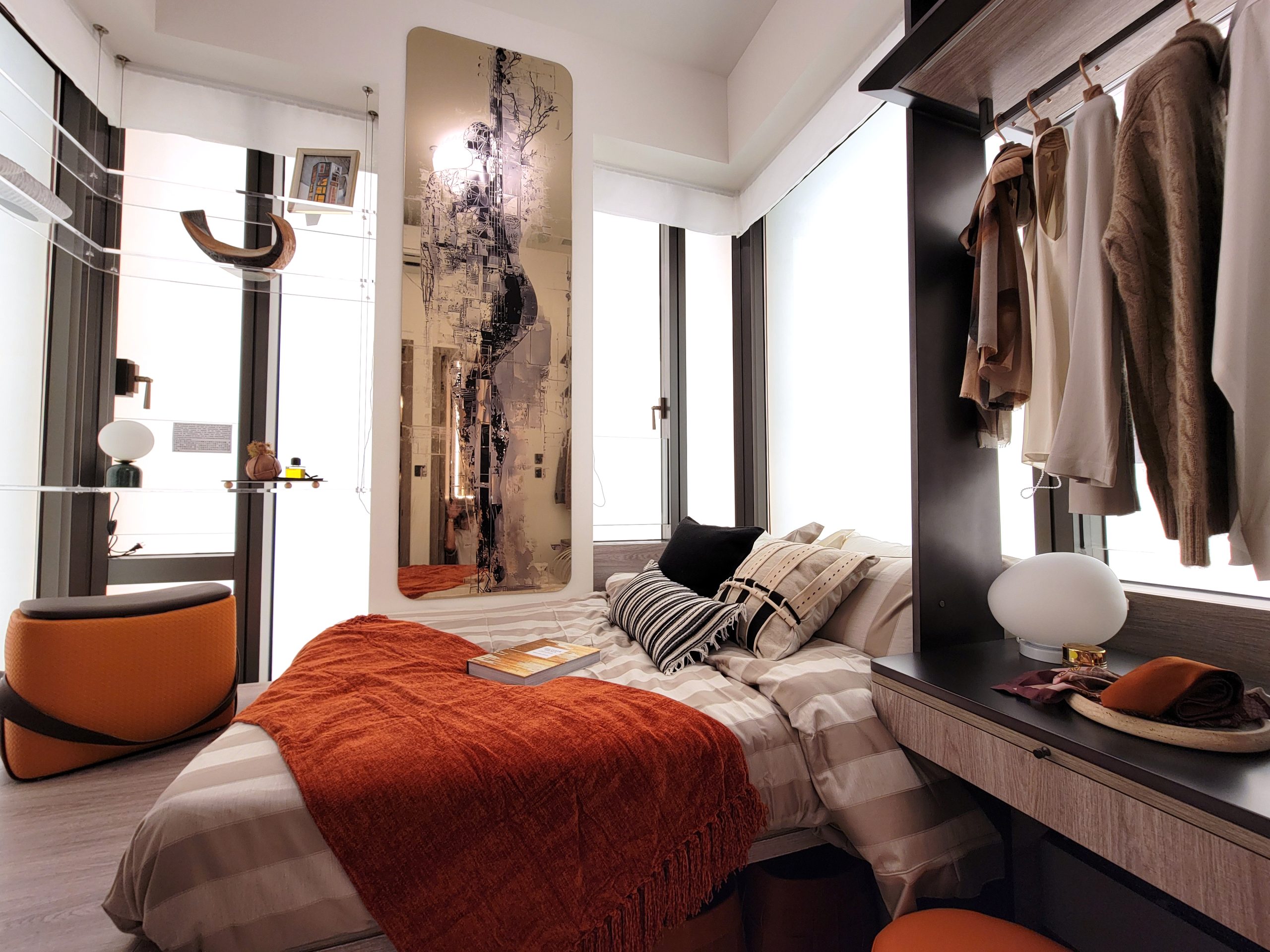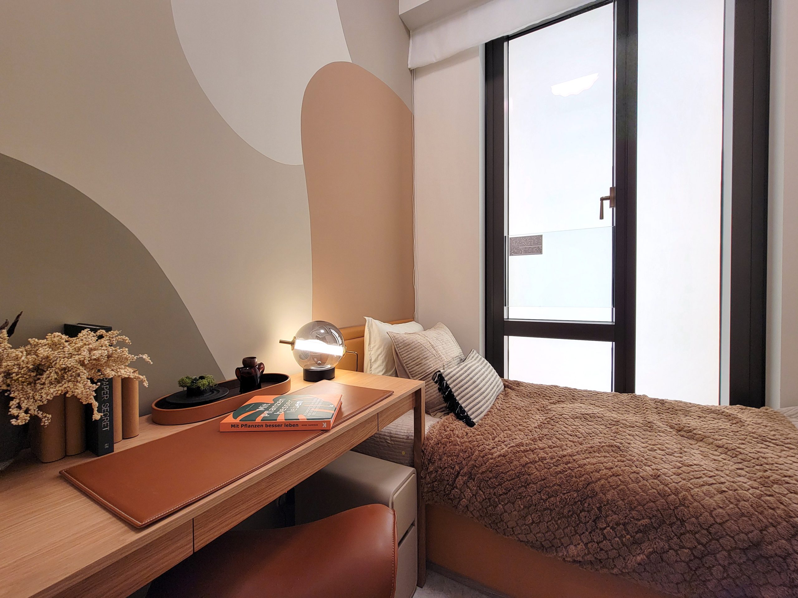 睡房1設計兼顧實用與舒適,書檯搭配大角窗引入自然光,打造明亮靜謐的工作氛圍。 窗外景致與室內空間交相輝映,讓人於專注之餘,也能尋得片刻的寧靜與靈感。另一睡房2則配備床、衣帽架與書檯連櫃,布局俐落,採光通風俱佳,為住客營造一處溫馨舒適的私人天地。此外,單位均配置一系列ARTIS配件如 Artisan Switches及 ARTISHANDLE,造型匠心獨到,更設有三合一智能門鎖ArtisLock,盡顯細節心思。