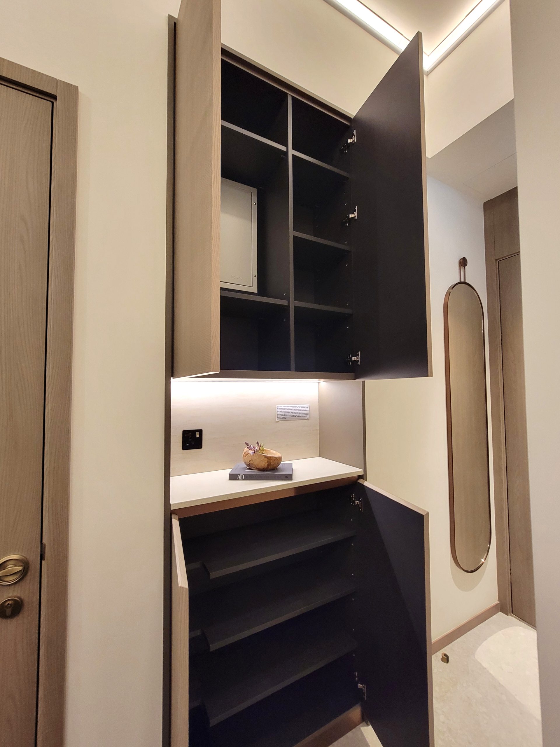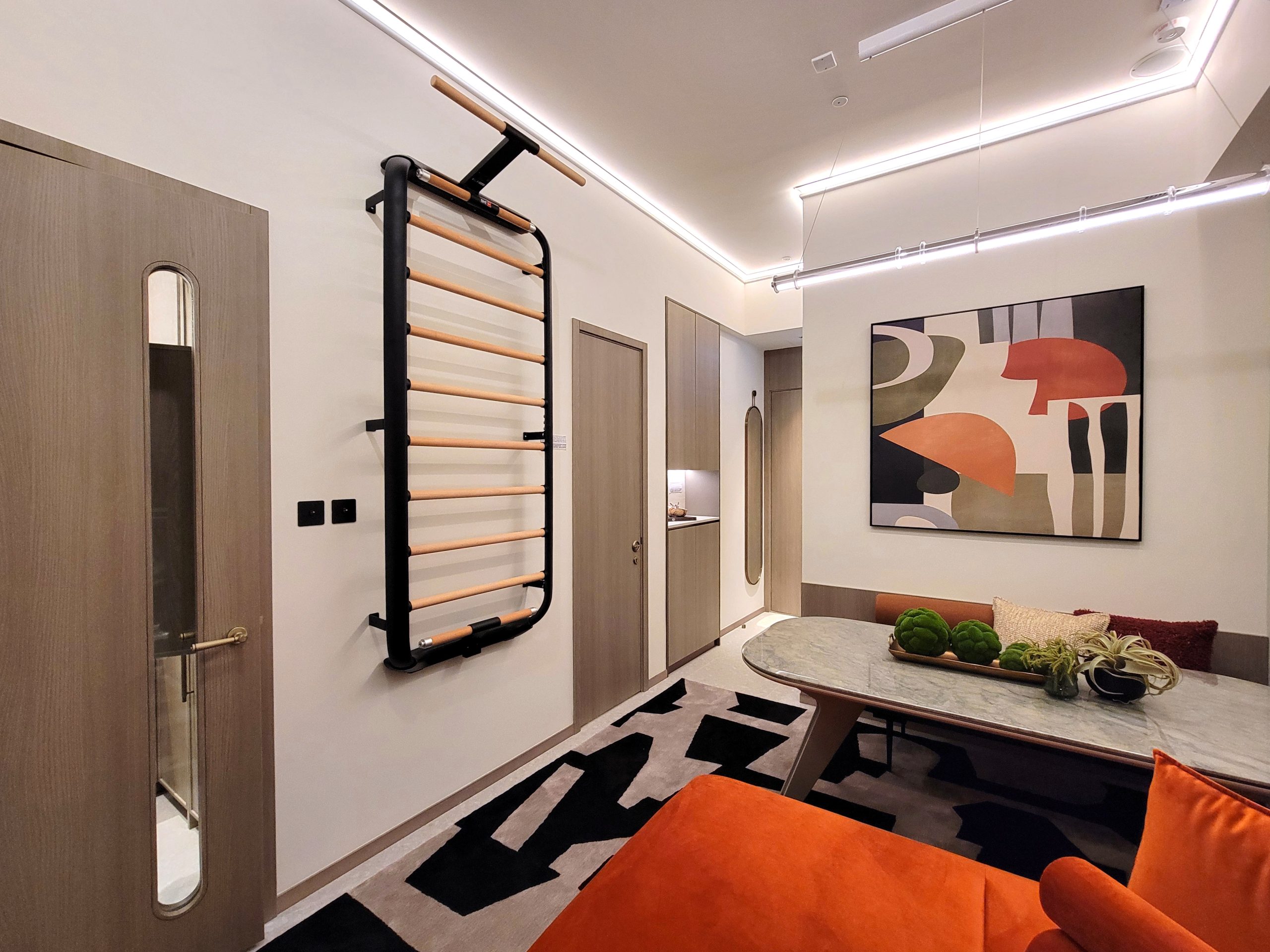 玄關的ARTISCABINET,設計匠心獨運,足夠收納鞋履、雨傘及各式日常出行物品,盡用每寸收納空間。大門後設有一塊全身鏡,方便住戶出門前整理儀容,開啟美好的一天。單位設計方正,靈活實用的空間佈局,可滿足住戶所需。客飯廳整體色調以大自然為靈感,選用柔和基調,並以點綴色調作對比,營造出層次分明而溫暖的氛圍,同時設置健身架,方便住戶隨時在家裡健身。沙發設計靈活貫通客飯廳,飯廳部分則配備可容納六人的飯枱,搭配富設計感的座椅,展現出設計上的巧思與生活品味。