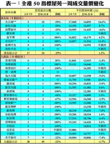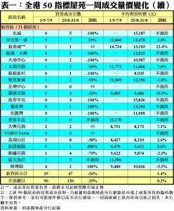至於,九龍區21個指標屋苑上周共錄38宗交投,較前周的49宗減少22%,當中將軍澳中心及將軍澳廣場各自僅錄2宗及1宗買賣,按周分別減少60%及67%;淘大花園交投量由前周的4宗,減少50%至上周的2宗;維港灣及柏景灣分別錄得1宗買賣,按周各自減少50%;美孚新邨錄得7宗交投,按周減少22%。此外,在全港50個指標屋苑之中,上周共有17個屋苑錄得「零成交」,較前周的8個增加1.13倍,當中港島區及九龍區分別佔3個及5個屋苑,新界區則佔9個(詳見表一)。