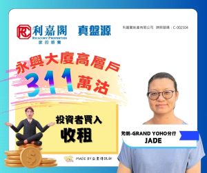 利嘉閣地產元朗區高級分區董事黃永全(Richmond)表示,元朗-GRAND YOHO分行客戶經理黃碧玉(Jade)最新促成元朗永興大廈高層8室的二手成交個案,單位實用面積約352方呎,屬1房間隔,望開揚景。