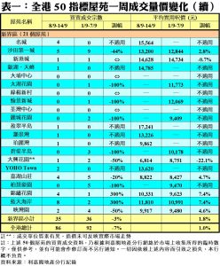 利嘉閣地產研究部主管陳海潮表示,市場新盤持續熱推,而部分準買家更寧願等待施政報告及美國議息此兩大重磅消息出台,故入市表現顯得較為審慎。綜合利嘉閣地產分行數據所得,全港50個指標屋苑於上周(8/9—14/9)共錄86宗買賣個案,較前周(1/9—7/9)的92宗減少近7%,為近四周新低。