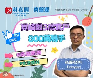 利嘉閣地產康怡區助理營業董事丁培鴻(Sam)稱,栢蕙苑分行高級客戶董事黃俊雄(Edmond)新近促成鰂魚涌寶峰園A座高層1室的二手成交個案,單位實用面積約823方呎,採3房1套間隔,外望開揚鬧市景。