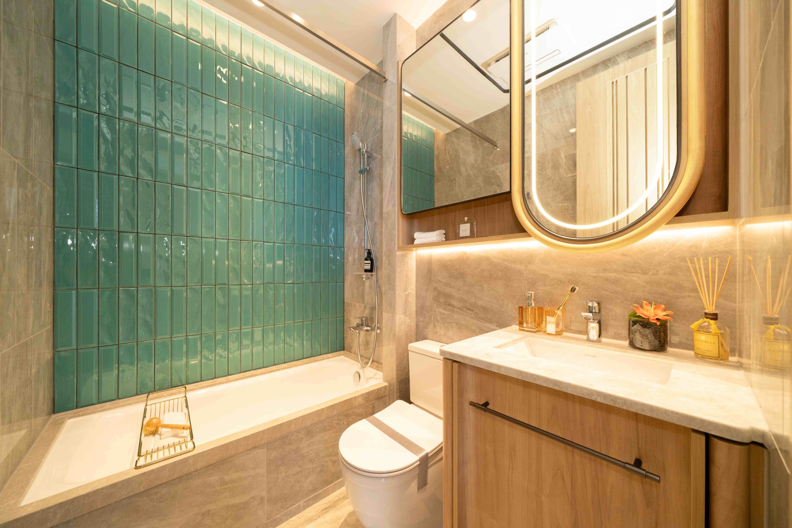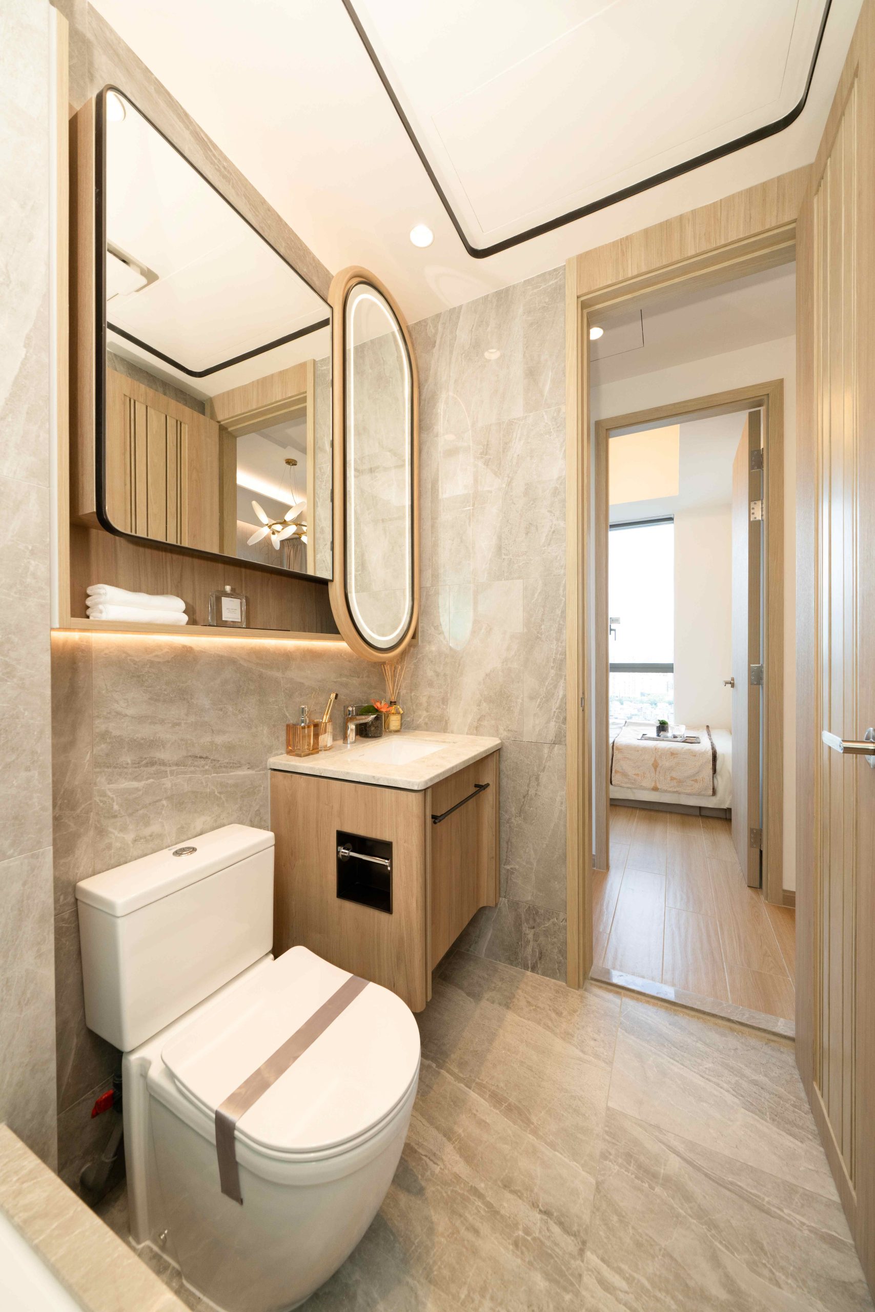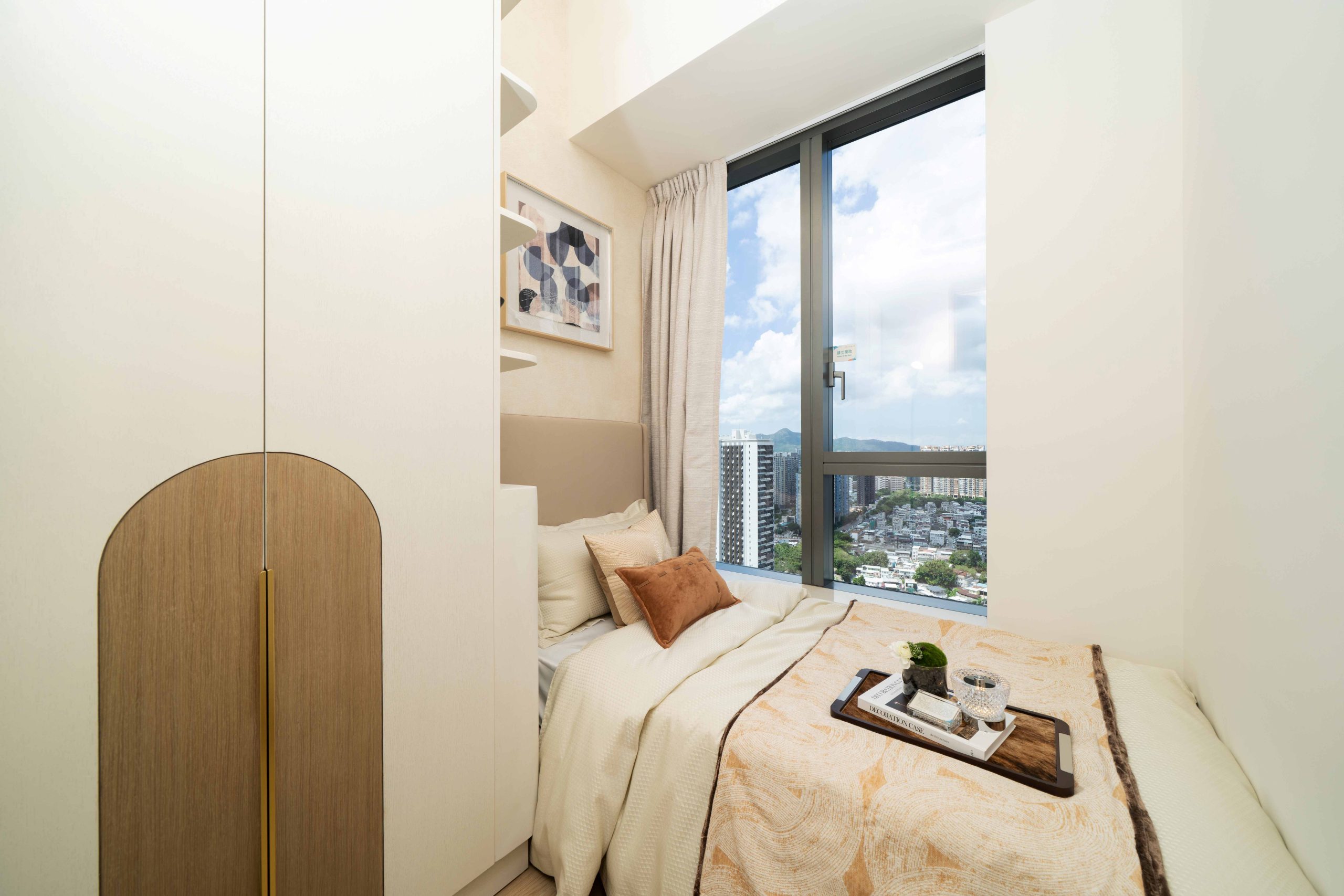 單位實用面積539方呎,開則方正實用,結合單位的特高樓底,層與層之間的高度達3.5米,大幅度提升室內的空間感。客飯廳長約5.4米,闊約2.5米,主人睡房最長處約3.1米,闊約2.3米,讓戶主可靈活地擺放不同類型的傢具。單位選用OVO為項目特別設計的傢俬及裝飾,以大地色系為主調,配以帶有金屬線條點綴的家品及裝飾,進一步展現單位內的藝術格調。以客飯廳為例,空間內之大型藝術特色牆,以淺褐色作基調,配襯拱門形狀之金屬線條,完美地與廳內同一色系的地毯及咕𠱸融合。單位內其他家品如大型金屬吊燈、衣櫃、書枱及書架均以同一色調完美呼應室內之暖色風格,並突顯單位的特高樓底優勢。客廳連接特大三合一露台,並擺放了戶外傢具,讓住戶更舒適地欣賞室外景緻。飯廳連接項目罕見的梗廚,當中MIA CUCINA的廚櫃以木飾面配襯方框設計,美觀優雅,廚房並附設電磁爐、抽油煙機、雪櫃、微波爐及洗衣乾衣機等全方位配備,既美觀又實用。另外單位之浴室設計時尚高雅,墨綠色牆身配以圓角處理的鏡框,令空間流露「城中森」的氛圍。
