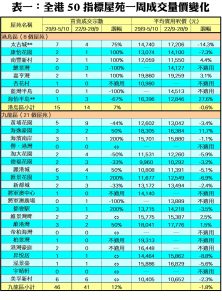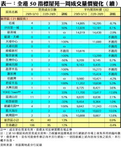 至於,港島區8個指標屋苑上周共錄15宗買賣,較前周的14宗增加7%,其中康怡花園、南豐新村及嘉亨灣各錄2宗成交,分別按周增加1倍;藍籌屋苑太古城交投量由前周的4宗,增加75%至上周的7宗。此外,在全港50個指標屋苑之中,上周共有12個屋苑錄得「零成交」,較前周的10個增加20%,當中港島區及九龍區分別佔2個及4個屋苑,新界區則佔6個(詳見表一)。