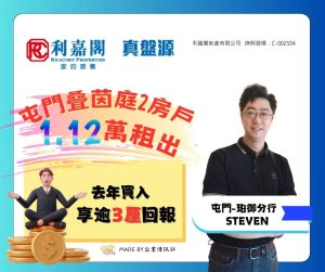 利嘉閣地產屯門-珀御分行高級經理陳志偉(Joe)稱,該行物業顧問蕭文滔(Steven)最新促成屯門叠茵庭3座中層A室的二手租賃成交個案,單位實用面積約376方呎,屬2房間隔,外望開揚景觀。