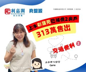 利嘉閣地產上水中心分行首席聯席董事黃靜顏(Yen)表示,該行客戶經理李文娟(Carrie)最新促成上水彩蒲苑C座中層5室的二手成交個案,單位實用面積約363方呎,屬2房間隔,向西,望樓景。