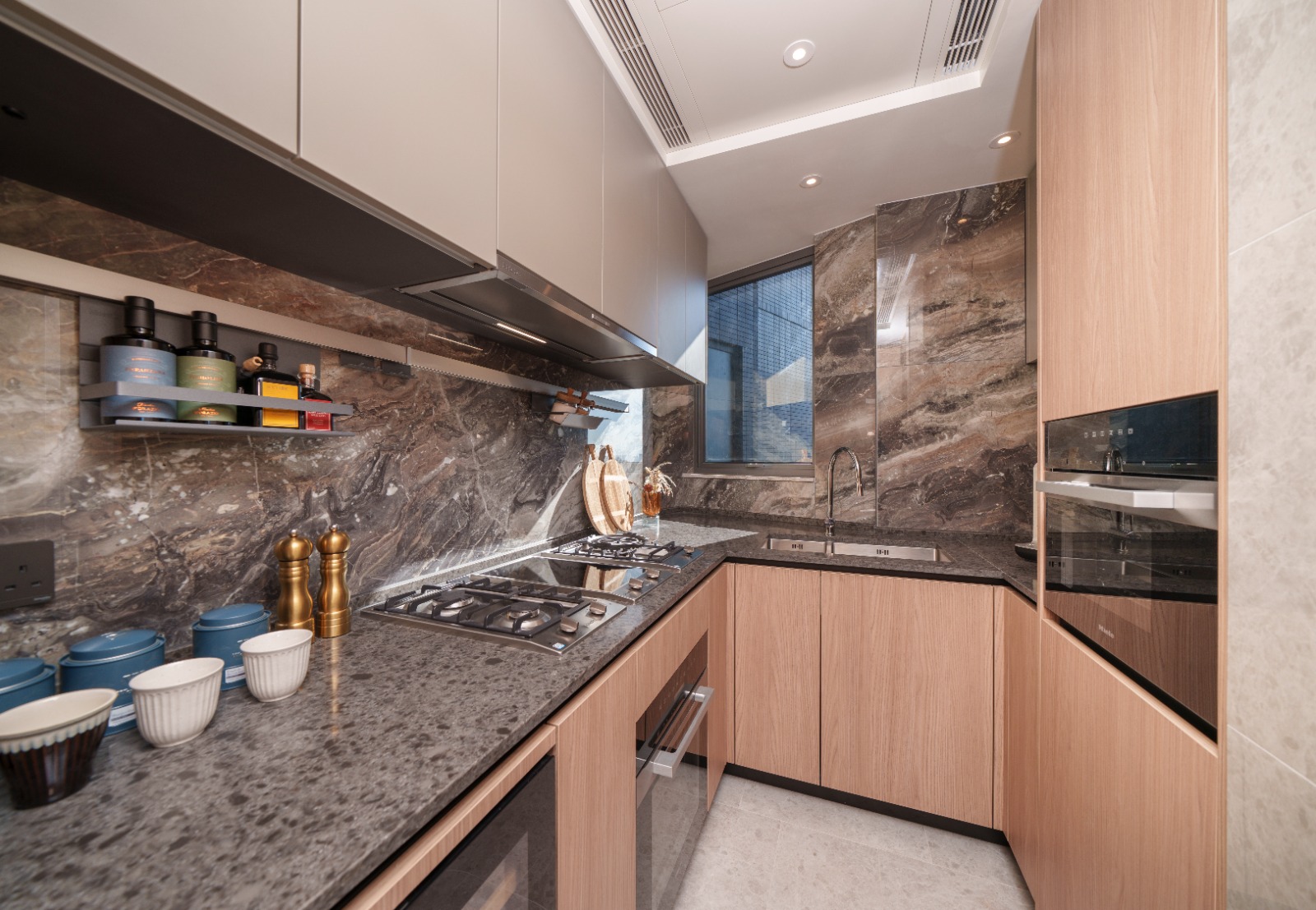 廚房屬梗廚設計,U型工作檯面採用亮麗人造石材,牆身採用仿雲石紋理瓷磚鋪面,美觀耐用;並配備多款歐洲知名品牌的電器及爐具,包括德國品牌Miele的蒸爐、焗爐、電磁爐、炒鑊、雙頭氣體煮食爐及抽油煙機,以及德國品牌Siemens之嵌入式雪櫃及洗衣乾衣機,更備有法國品牌Vinvautz酒櫃及意大利Gessi水龍頭,讓住戶享受入廚的樂趣;廚房設有獨立冷氣機,讓烹飪空間進一步昇華。