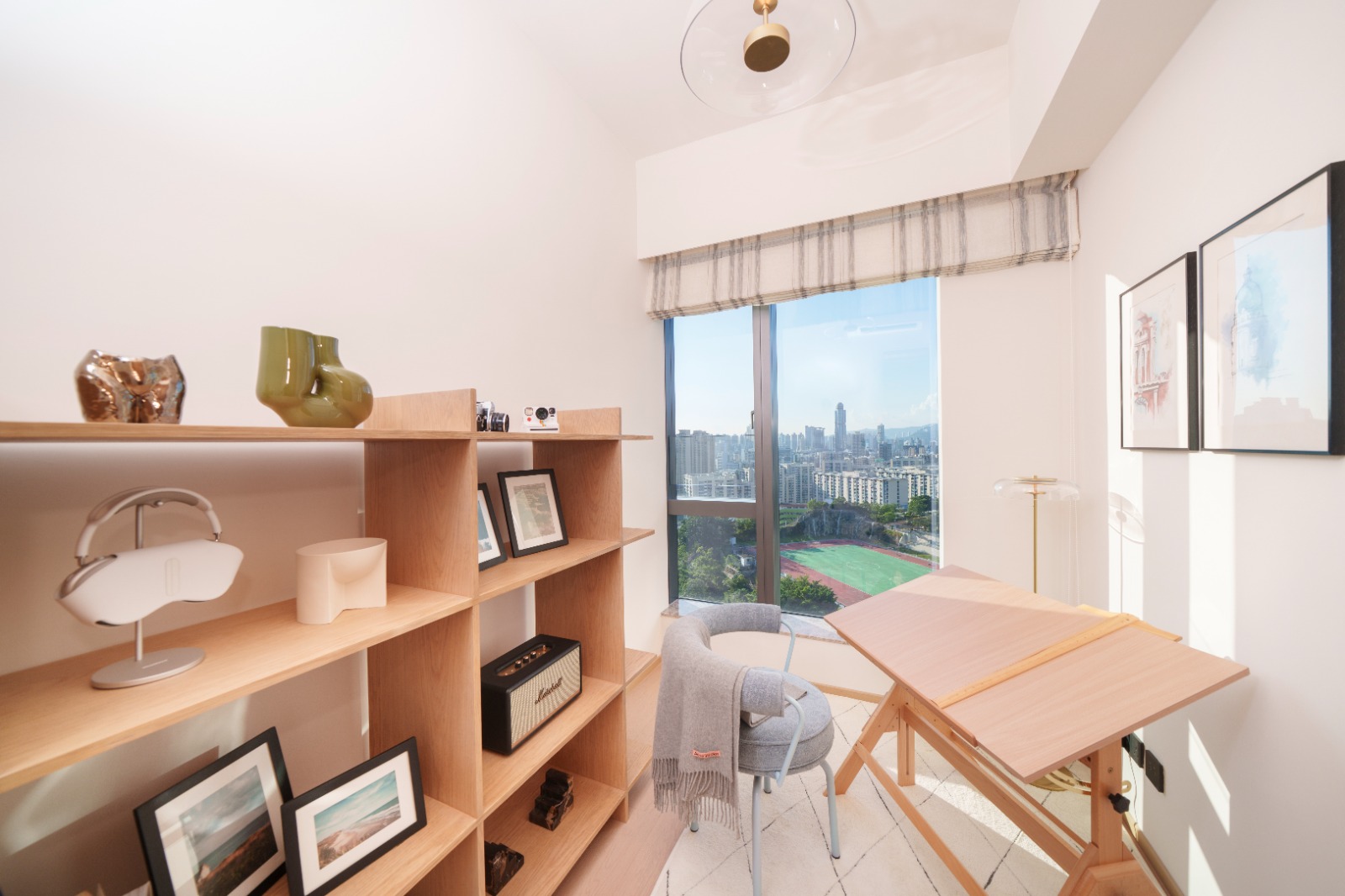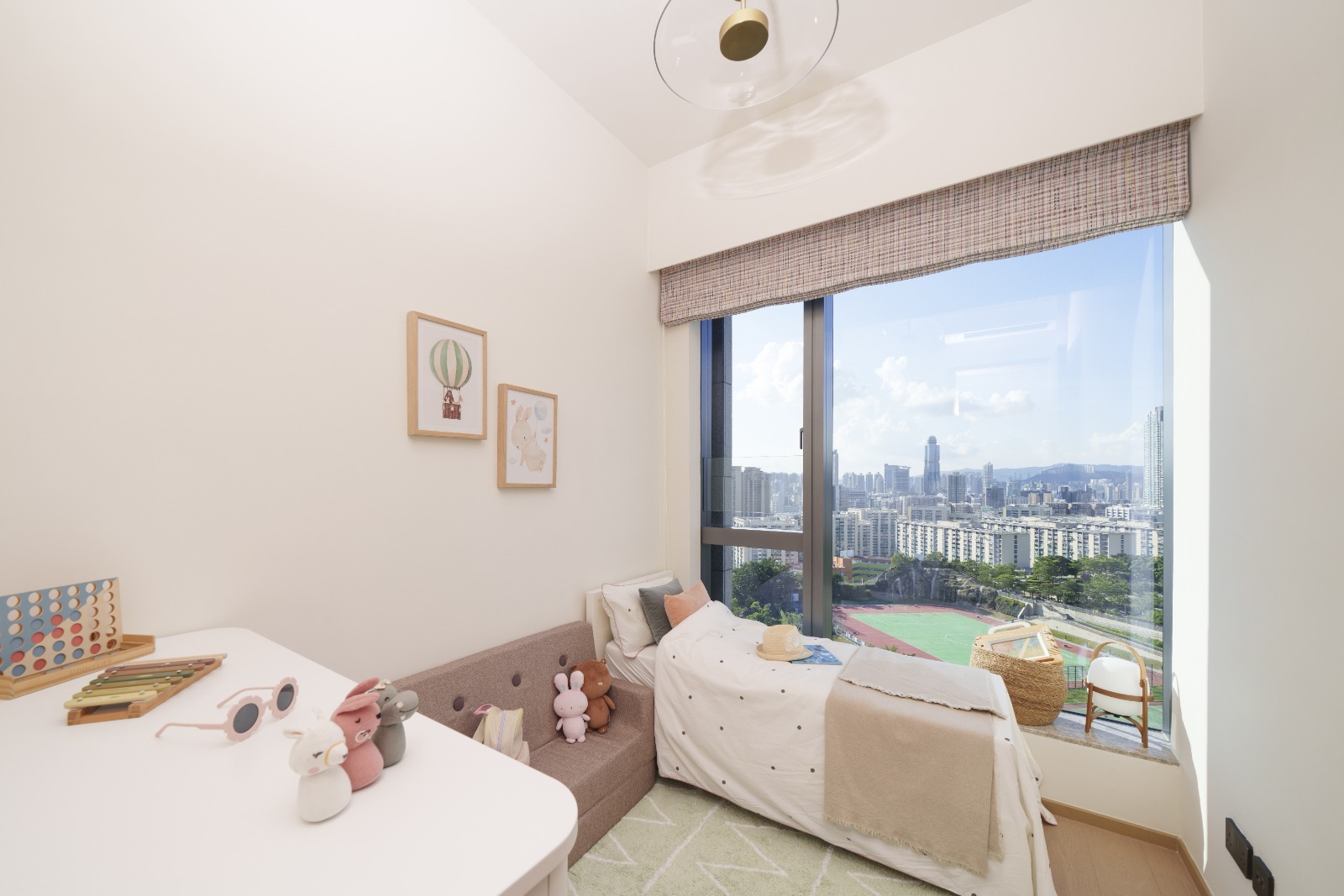其中兩間睡房間隔方正實用,同樣外望開揚公園景致,打造成兒童睡房及畫室,處處透露柔和的溫馨感覺。兒童睡房設計佈置別具溫馨感,運用了多種粉色調傢俱及裝飾。睡房重點落在房間中央偌大的梳化區,淺棕色的梳化配上柔軟、淡綠色地毯,牆上掛了充滿童趣的插圖,打造成小朋友與家長談心與玩樂的天地,兩旁分別放置衣櫃及睡床,實用與一應俱全。畫室空間感十足,擺放木質繪圖桌及木書架,貫徹單位簡潔、優雅的風格,建構寧靜的心靈空間 ,自然光穿透大窗戶,灑落整個房間,呼應自然光影與生活節奏的優雅質感。