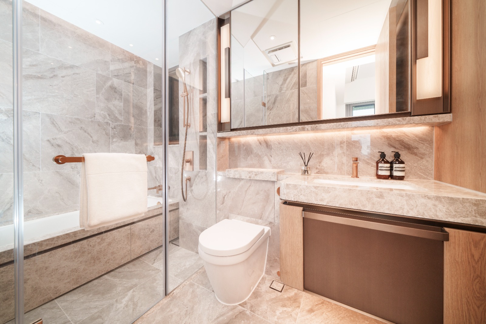 主人套房設有特大窗戶及私人平台,外望開揚開揚何文田公園及京士柏上配水庫遊樂場綠意景致及眺望西九龍海景,有利採光;主人套房散發著時尚和優雅,呈現現代感和奢華舒適感。舒適的雙人大床,三邊方向均可輕鬆落床,兩側擺放著時尚的床頭桌;房間預留衣櫃位,深棕木色的衣櫃以及化妝台,展現低調華麗的氛圍;主人房浴室採用明廁設計,嚴選仿雲石紋理瓷磚打造牆身及地台,配備一系列國際品牌浴室設備,如德國品牌Villeroy & Boch座廁和洗手盆,以及意大利品牌Gessi洗手盆水龍頭和花灑套裝;主人浴室別具氣派,設有淋浴間及配備浴缸,讓戶主享有更優質的私人空間。