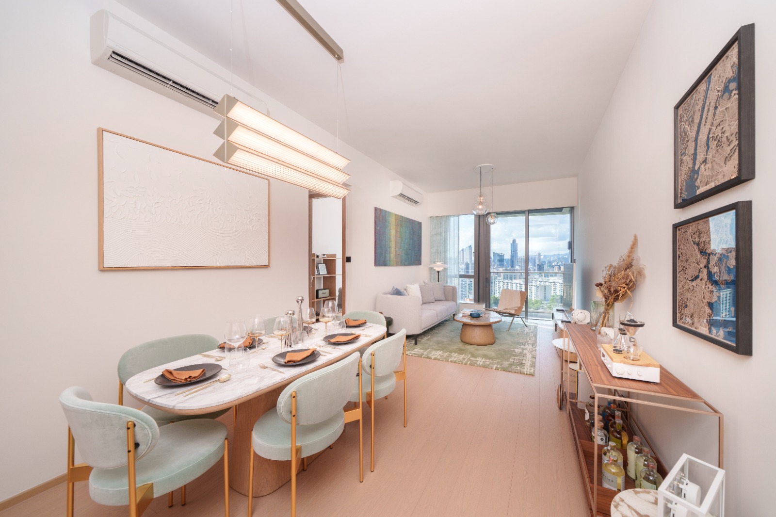 華懋集團與港鐵合作發展何文田站新盤「瑜一」第IA期「瑜一.天海」現樓銷情熾熱,首度開放第2座(2B)西九龍方向三房現樓示範單位,單位靈感源自室外層層綠意,透過不同質感的布料、石材及木材,營造豐富且層次感十足的色彩,突顯自然景觀與寧靜氛圍。每個空間均以精選燈具與藝術品作為設計焦點,整體風格統一和諧,為年輕精英家庭打造安靜、柔和且奢華的生活環境。