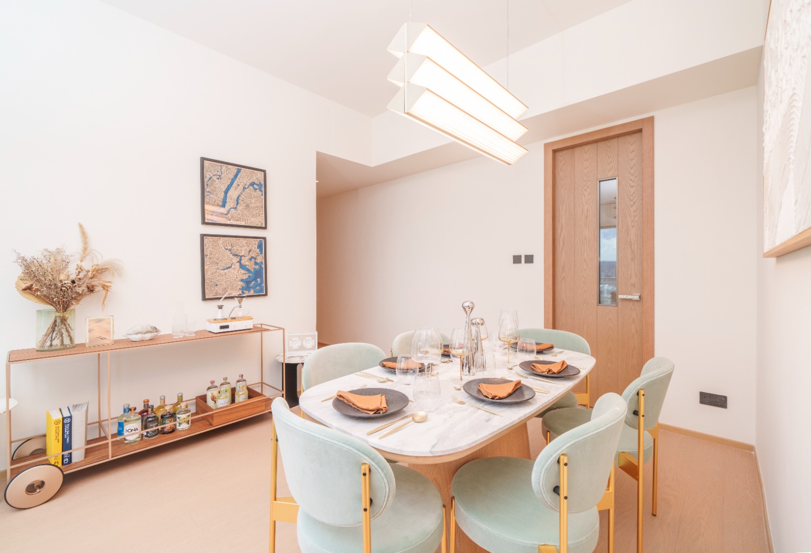客飯廳為長形開則,間隔寬敞實用,長逾7.2米、闊約3.25米,連接約27平方呎露台,配以落地玻璃趟門,窗外景觀開揚,廣納自然光線。呼應窗外何文田公園及京士柏上配水庫遊樂場的綠意,客飯廳以自然綠境為主題,採用不同層次的綠色家品及藝術品。單位層與層之間的高度約3.225米,空間感十足,設計師特意在飯廳及客廳分別掛上多邊形的精選燈具及如花苞形般的吊燈,為室內增添豐富層次感;大門旁邊設有儲物室及洗手間,為住戶增添儲物位置,空間使用上更為靈活。