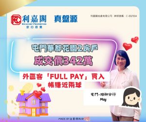 外區客「Full Pay」購屯門華都花園2房戶 成交價342萬元 業主帳賺近兩球