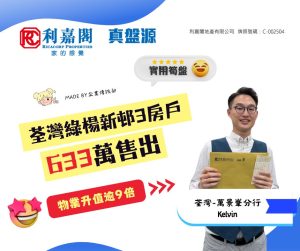 利嘉閣地產荃灣-萬景峯分行聯席董事周煇宏(Jacky)稱,該行高級客戶董事黃水申(Kelvin)最新促成荃灣綠楊新邨J座低層8室的二手成交個案,單位實用面積約582方呎,屬3房間隔,望市景。