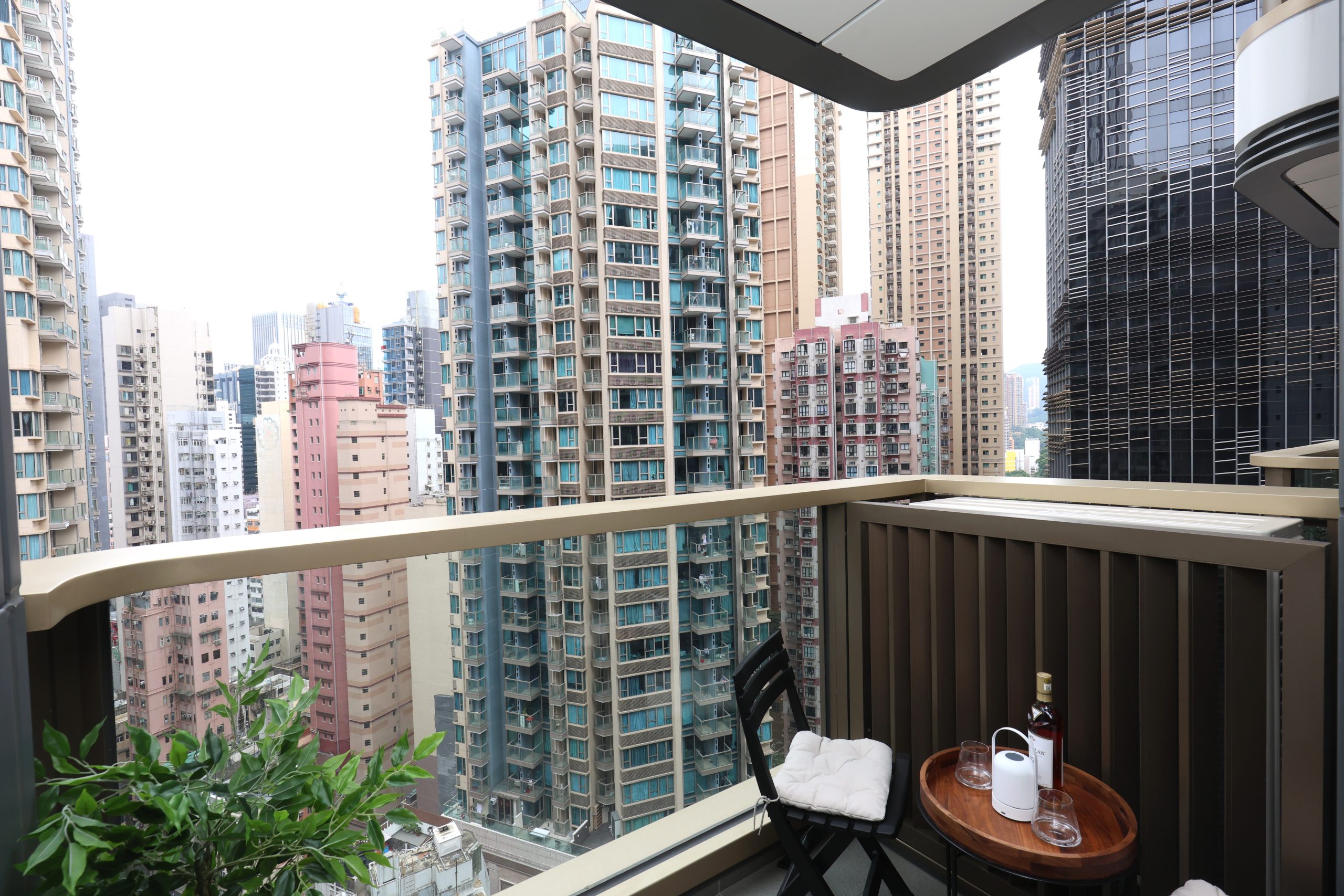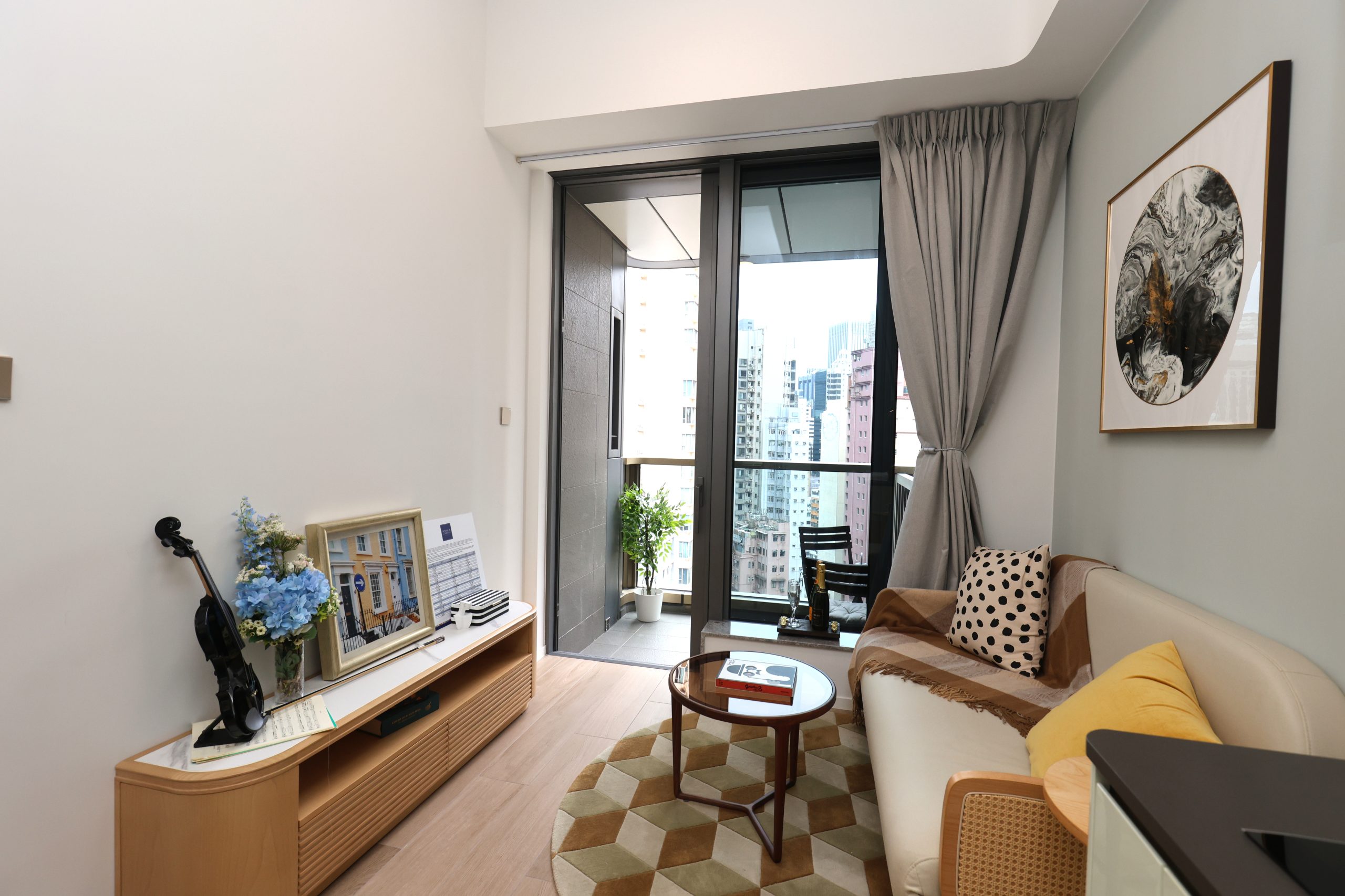 單位內櫳不設玄關,客飯廳長約5.5米,間隔方正實用;特別加入藝術品及綠植作點綴,呼應灣仔的多元文化藝術韻味。單位層與層之間高度達3.5米,空間廣闊,使用更靈活多變。三合一露台空間寬敞,設木色系小茶几與座椅,營造休閒戶外時光。