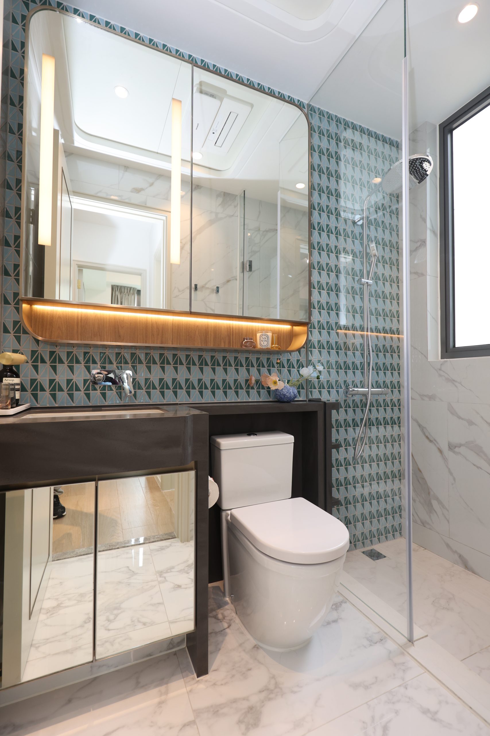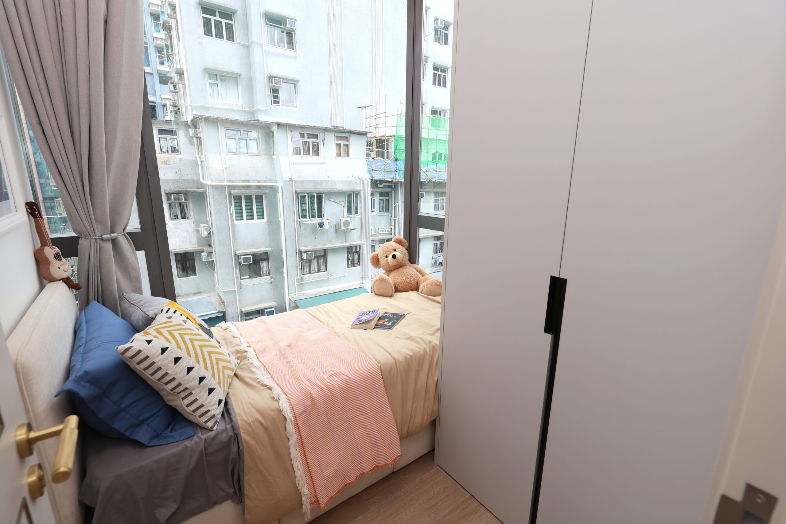 主人房空間感十足,放置雙人床及衣櫃後,仍有充足活動空間。兩間睡房均採用廣闊L型觀景玻璃幕牆,盡享開揚景色。至於浴室設有窗戶,引入自然光線、通風效果更佳,更設千鳥格馬賽克瓷磚特色牆,突顯英倫風格。