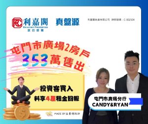 利嘉閣地產屯門市廣場分行首席聯席董事莊國寶(Jason)稱,該行高級客戶董事黃秀鳳(Candy)及吳港雄(Ryan)共同促成屯門市廣場2期1座中層G室的二手成交個案,單位實用面積約335方呎,屬2房間隔,望內園。