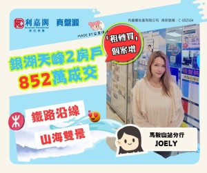 利嘉閣地產馬鞍山區營業董事歐偉基(Ray)稱,馬鞍山區本月至今暫錄約65宗二手買賣成交,較上月同期有所增加,主要受惠於減息令供樓成本降低,繼而出現多宗「轉租為買」個案。其中馬鞍山站分行高級客戶經理鍾夢思(Joely)最新促成馬鞍山銀湖天峰8座高層C室的二手成交,單位實用面積約539方呎,屬2房間隔,望海景及山景。