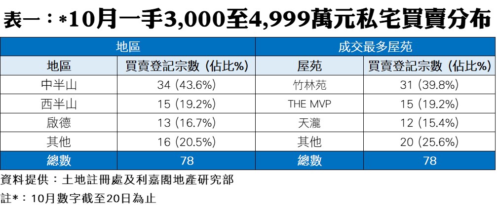 在10月份首20天的一手私宅成交中,按地區劃分(見表一),以中半山的34宗佔最多(佔比達43.6%),其次為西半山的15宗(佔比達19.2%),第三則為啟德的13宗(佔比達16.7%),三者合計已佔逾79.5%,反映中、西半山及啟德都是豪宅集中地及投資移民樂意追捧的地區。