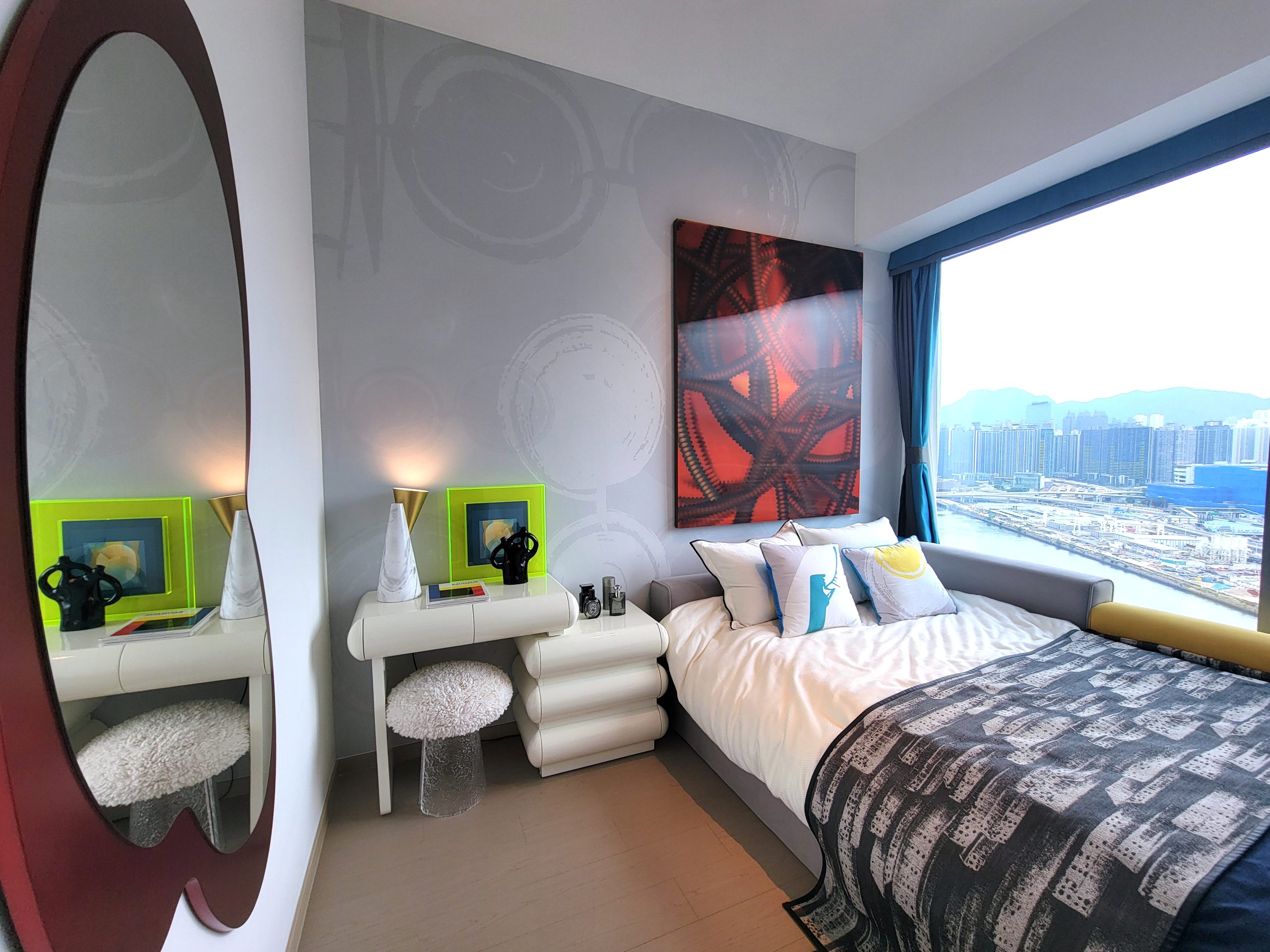 主人房貫徹單位設計風格,以簡約線條勾勒出優雅的美感,配紅色曲線牆身鏡作點綴。睡房擺放標準雙人床,床頭放置白色烤漆可伸縮梳妝台兼床頭櫃,自由組合,高效利用空間。