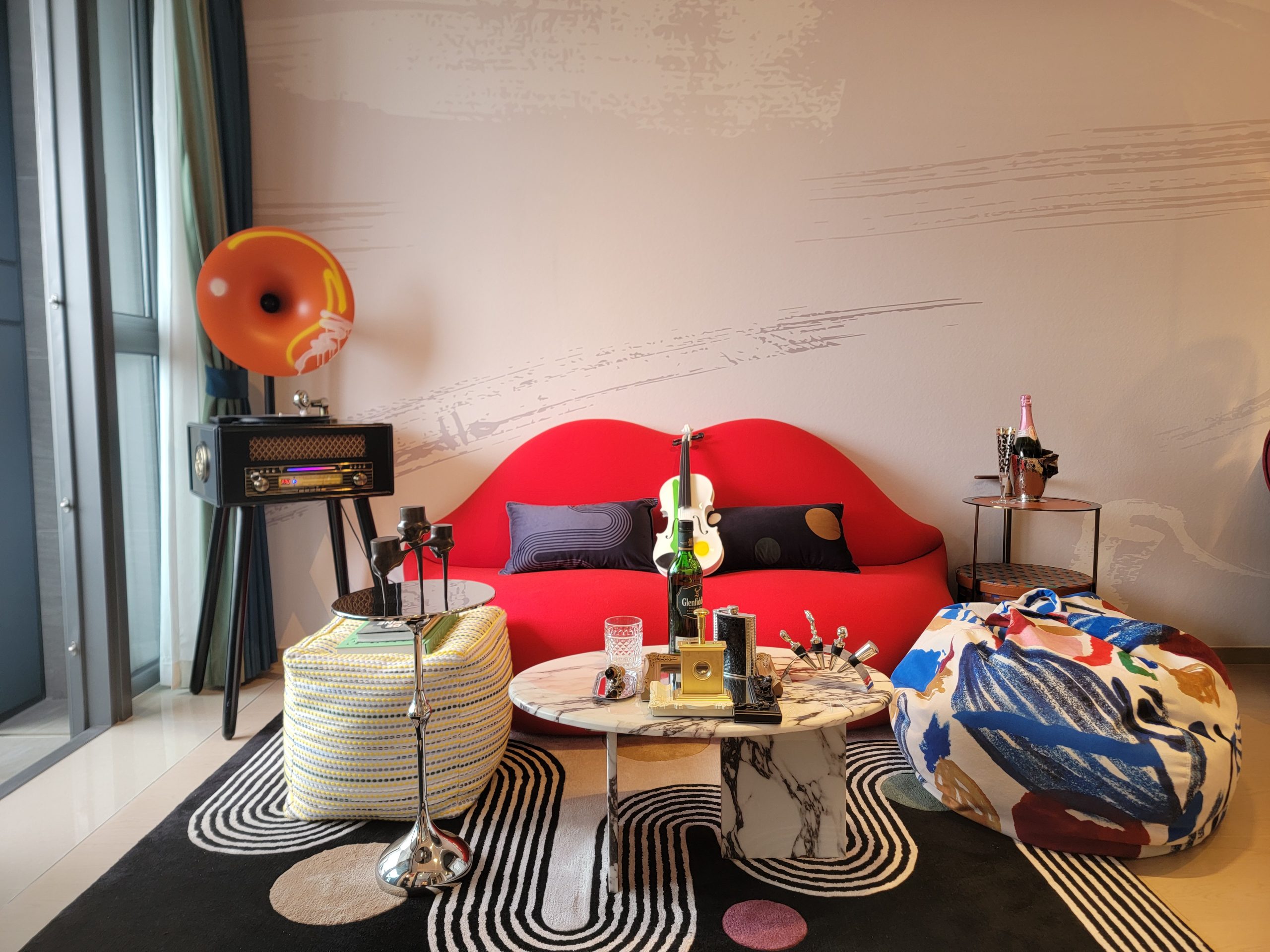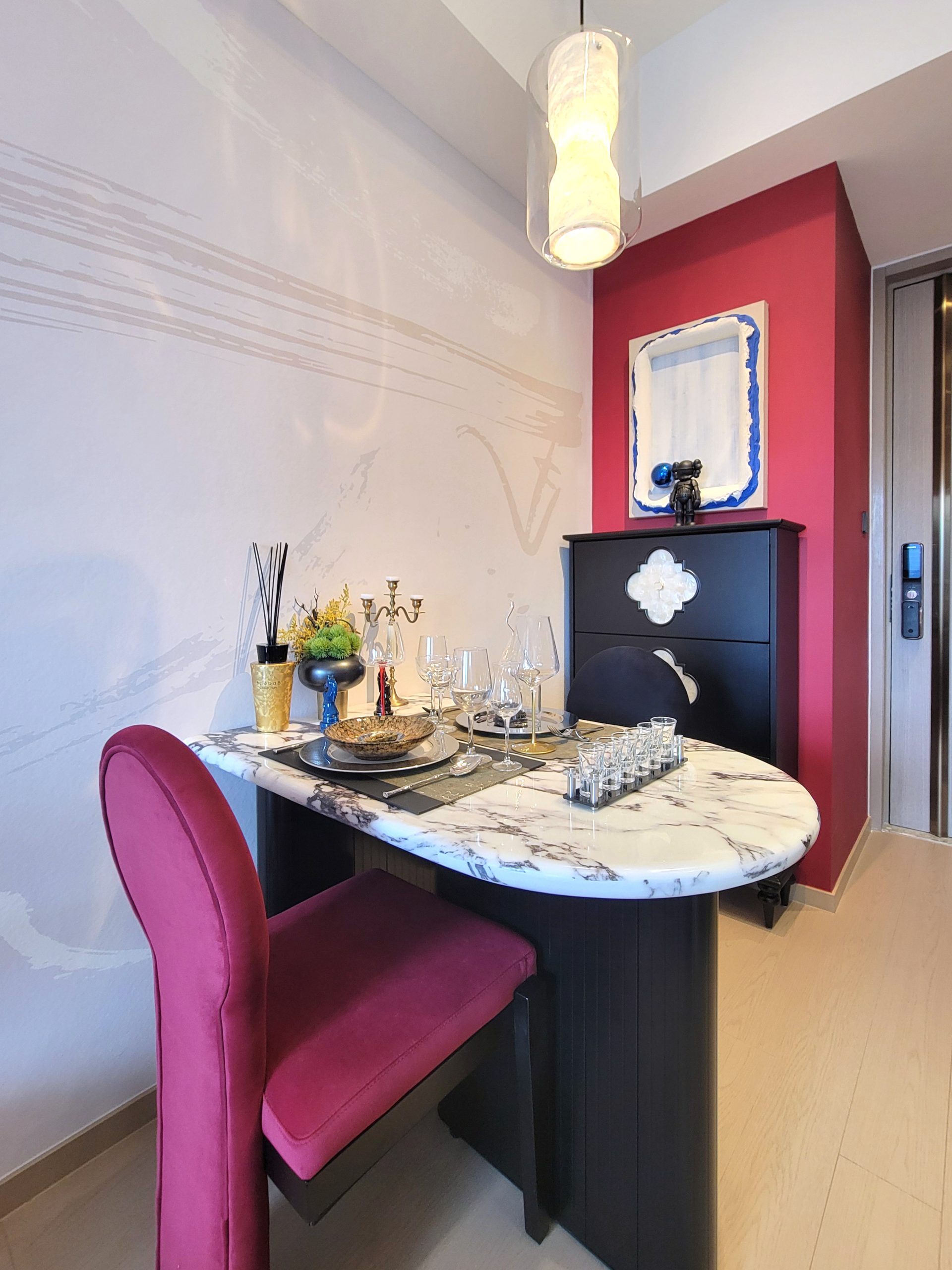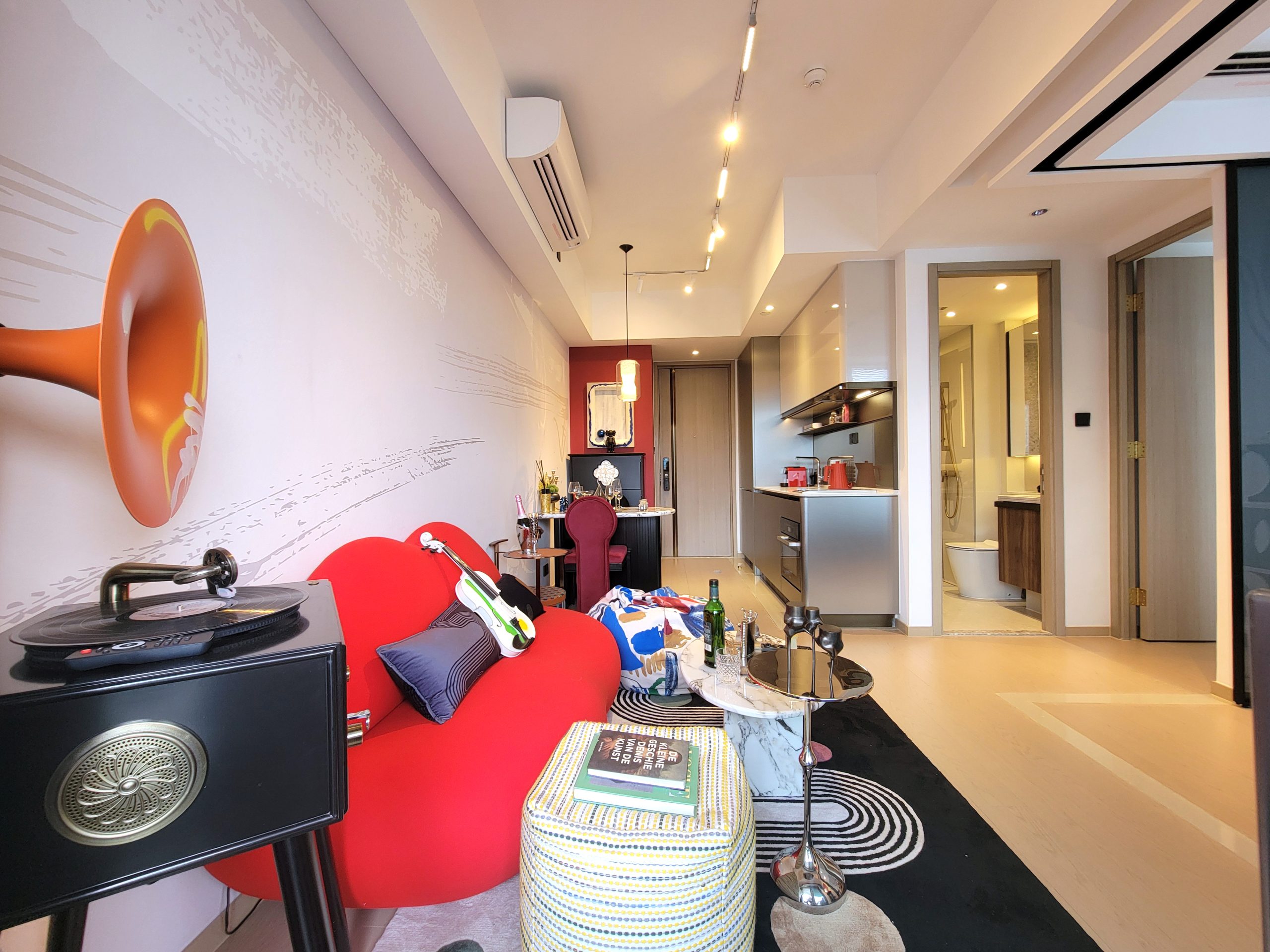 單位間隔四正,空間感十足。長方形的客飯廳不設玄關位,盡用大廳每吋空間。寬敞通透的格局讓陽光自然流入室內,營造明亮舒適的環境。鮮明大膽的色彩搭配,客廳擺放藝術個性搶眼紅唇沙發,搭配黑白條紋設計地毯,為空間增添活力和個性。