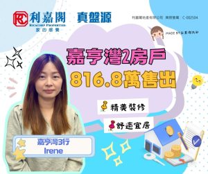利嘉閣地產嘉亨灣及杏花區嘉亨灣3行經理梁瑞安(Nelson)稱,該行客戶董事曾愛蓮(Irene)新近促成西灣河嘉亨灣1座低層D室的二手成交個案,單位實用面積約504方呎,採3房間隔,外望開揚景觀。