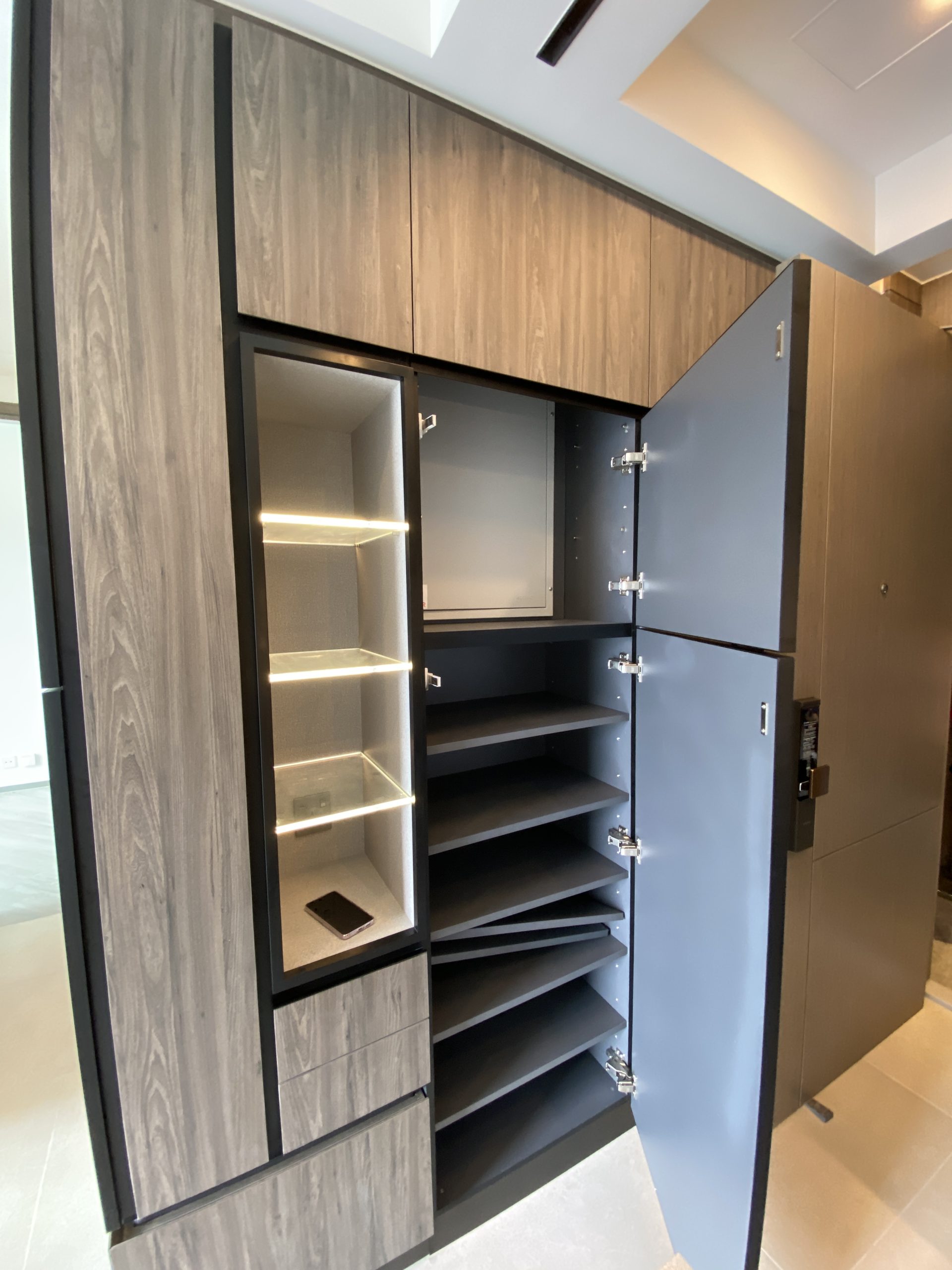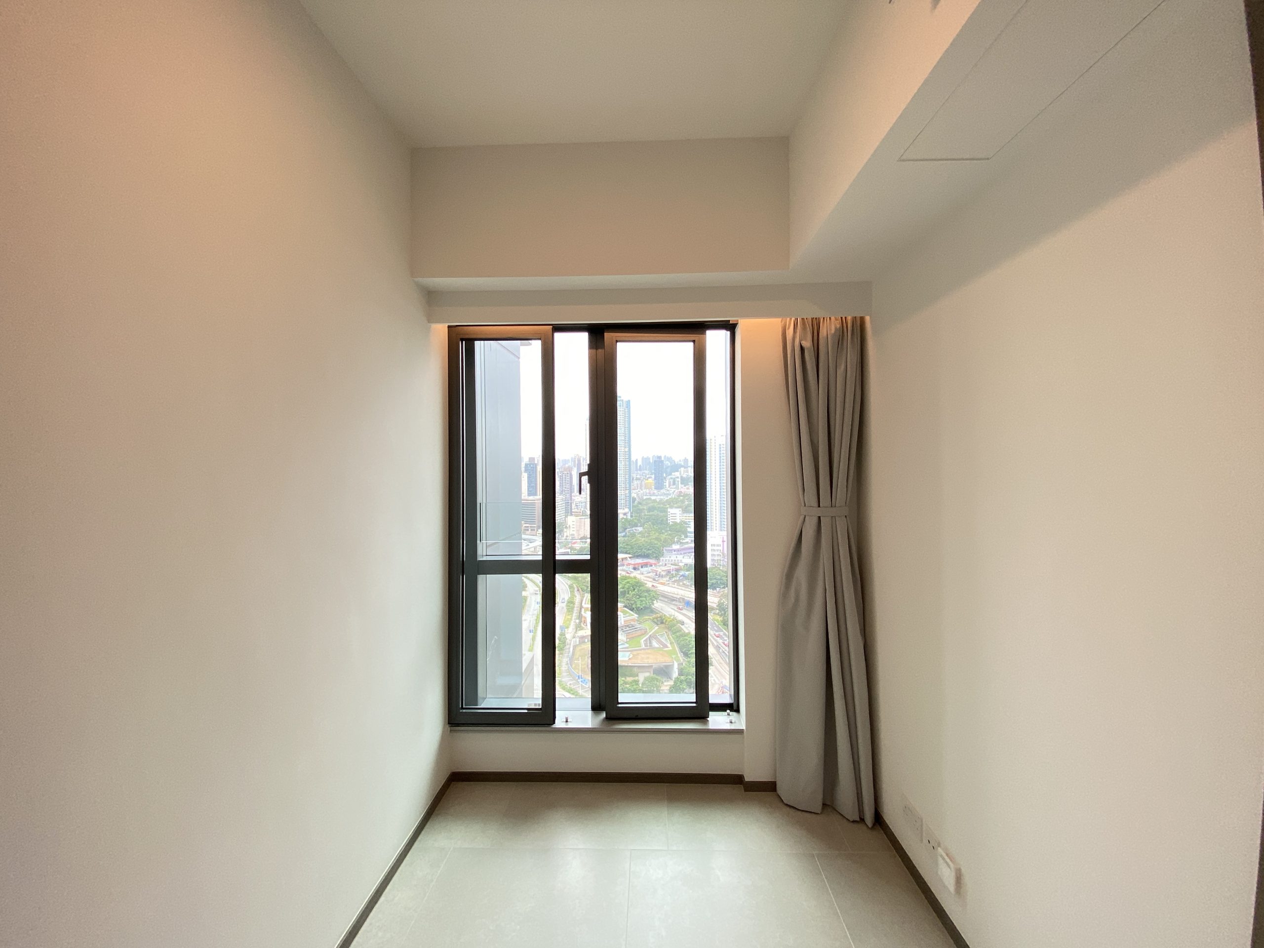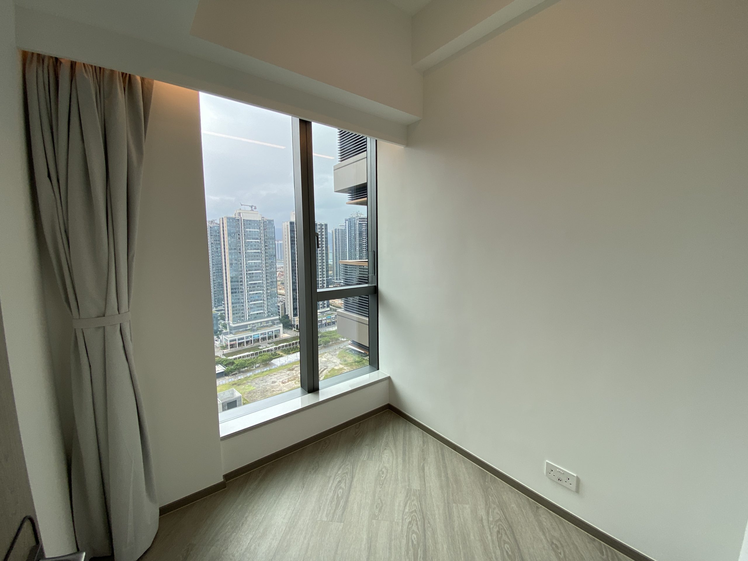 單位大門旁邊設有多組儲物櫃,為住戶提供充足的儲物空間。開放式廚房配備部分家電,並設有摺疊式餐桌,有需要使用時才打開,能夠節省空間。兩間睡房與客廳同一坐向,外望啟德車站廣場景。睡房開則四正,設有大玻璃窗提升採光度,而主人睡房門後有預留位置,讓住戶可訂造衣櫃。