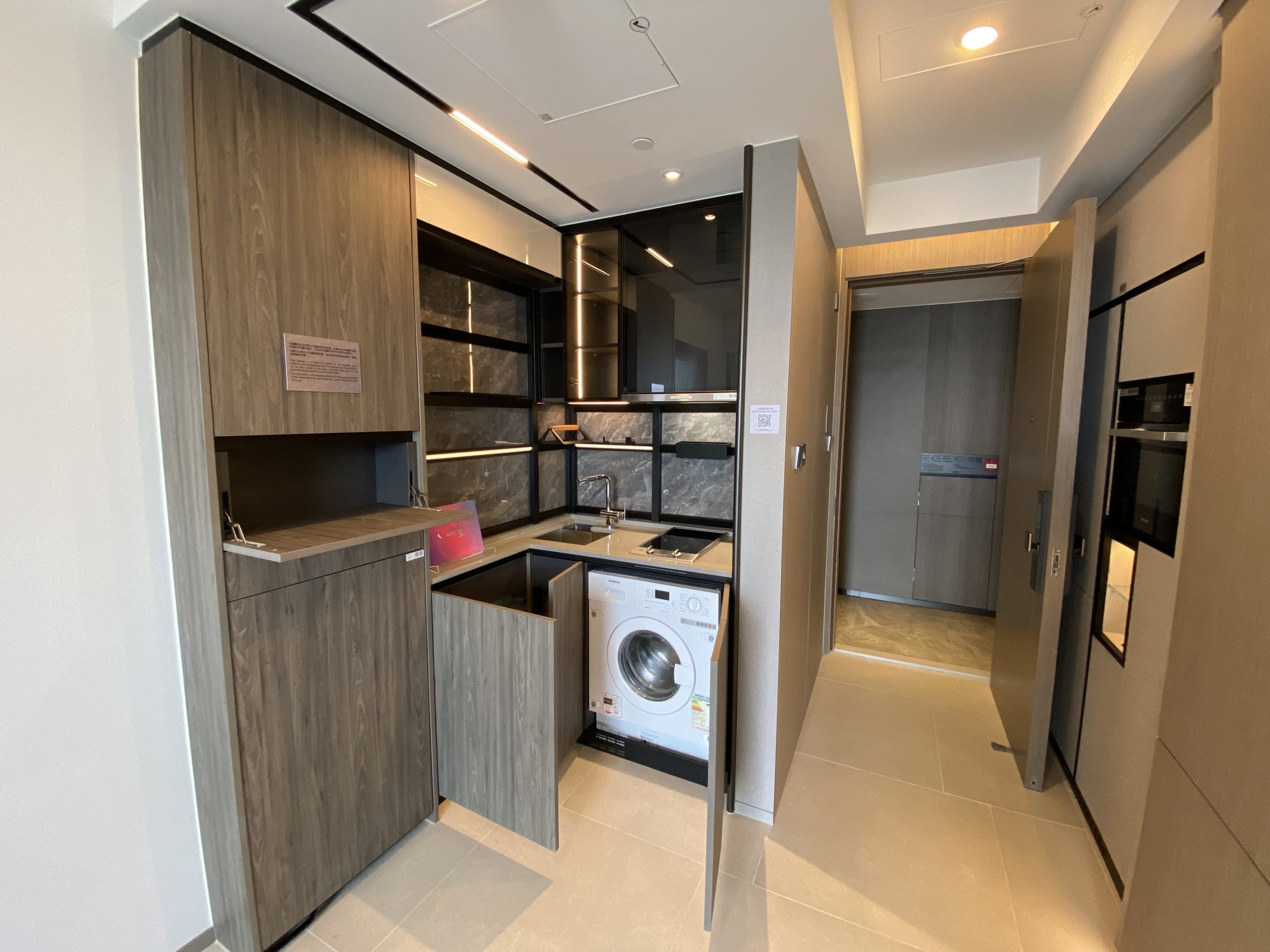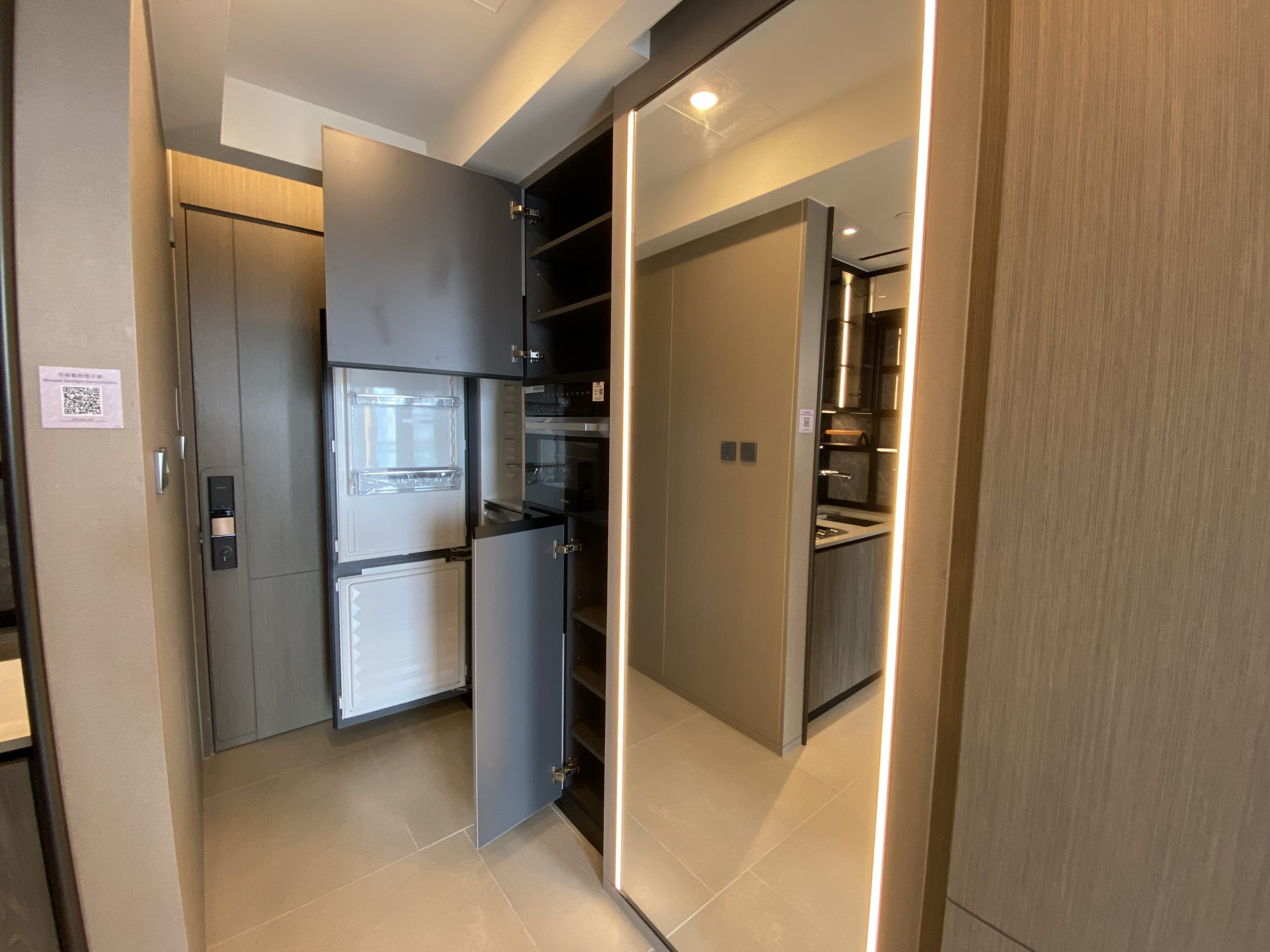客飯廳一面牆身設有落地玻璃鏡,視覺上提升空間感。開放式廚房配備部分家電,並設有摺疊式餐桌,有需要使用時才打開,能夠節省空間。睡房及浴室同樣採用趟門設計,節省空間,而浴室則位於睡房內。
