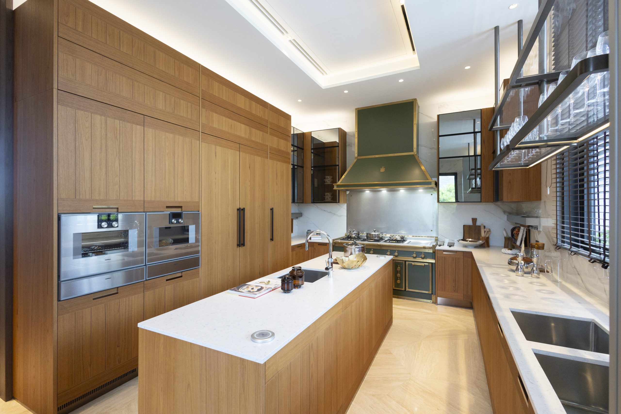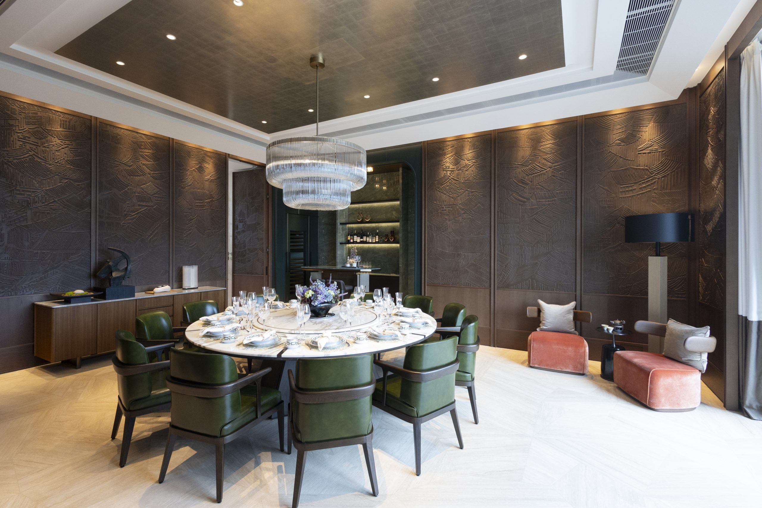 地面樓層的飯廳達570方呎,連接逾2,767方呎的前後花園,延續木石主題。特色牆以人手雕刻木質面板描繪山村景象。玻璃吊燈懸於十二座白色大理 石餐桌上,營造摩登古堡的典雅氣派。餐桌旁設翡翠石酒吧、SUB-ZERO酒櫃及氮氣急凍杯機等。逾300方呎廚房配備Arclinea櫥櫃、頂尖意大利品牌Officine Gullo抽油煙機及煮食爐以及17件Gaggenau廚房設備。Gullo廚具源自佛羅倫斯,承襲十九世紀傳統,純人手打造,工藝如藝術珍品。地面層洗手間以 綠色瑪瑙、流線型鏡子及竹形金屬支架打造,營塑高級氛圍。寬敞聚會空間由 室內自然延展至戶外,設計平衡奢華與質樸、古典與現代,成就獨樹一幟的生活格 局。