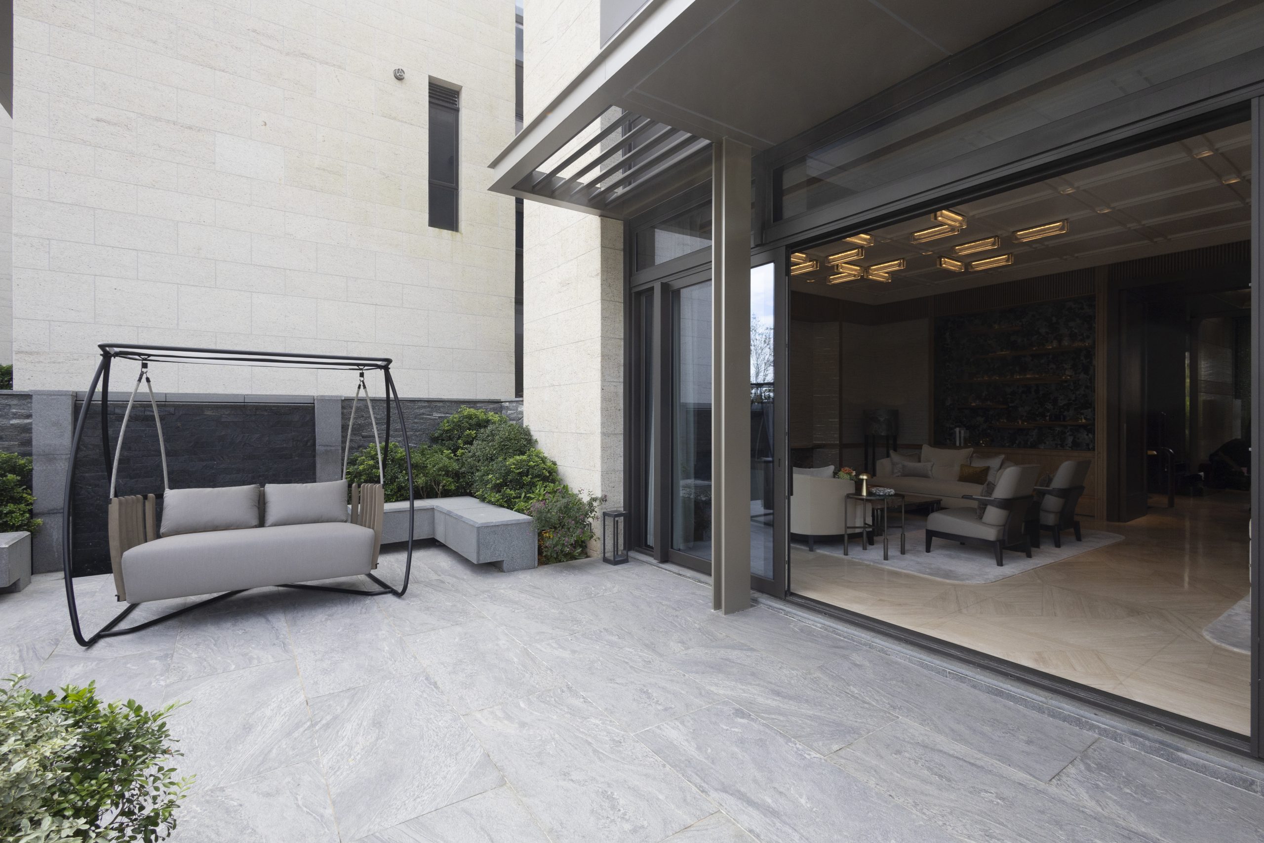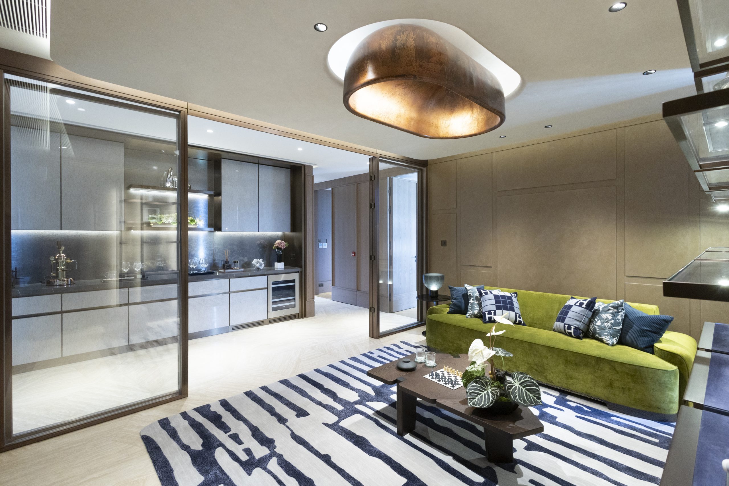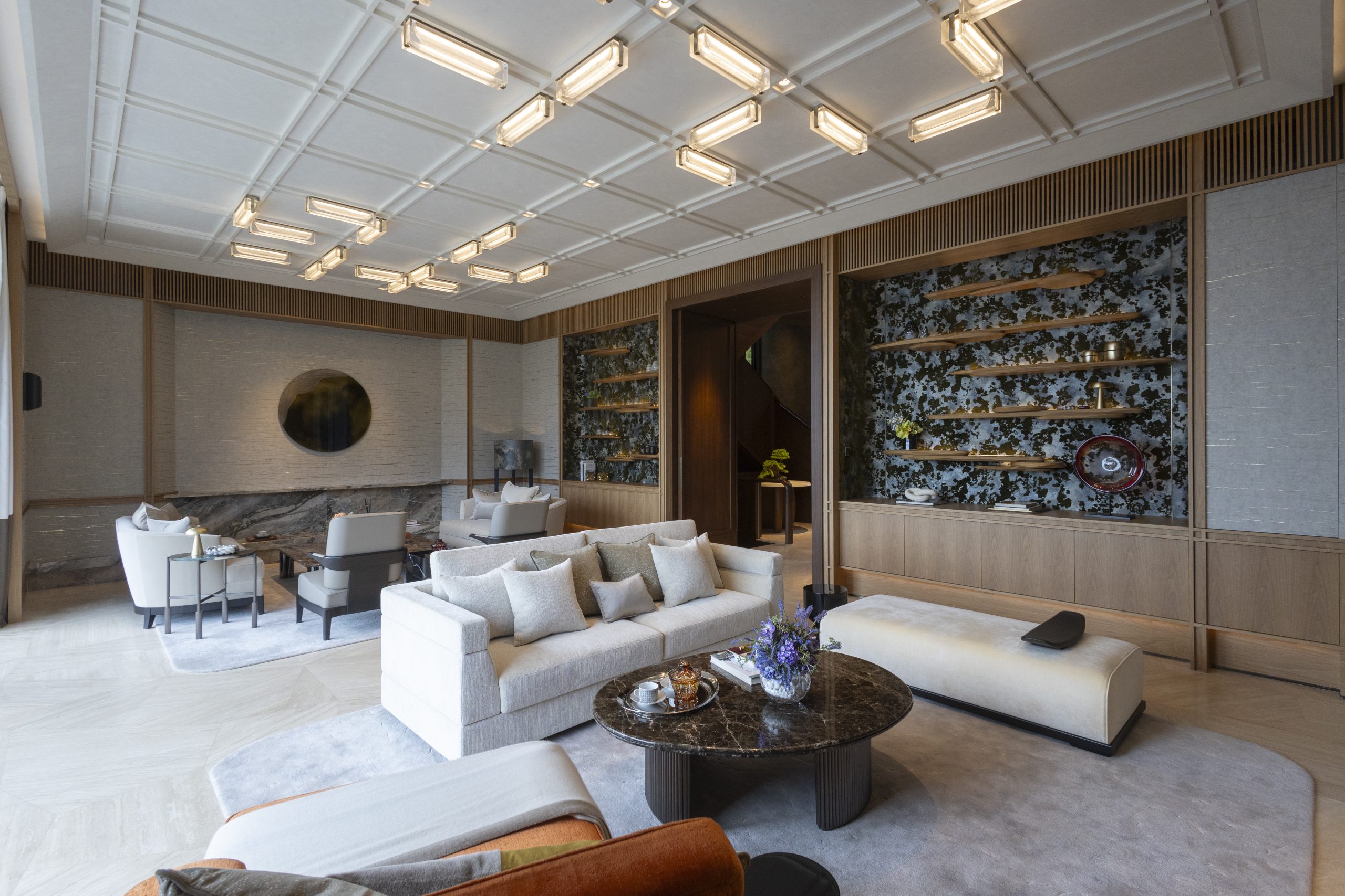 客飯廳連前後花園逾4,000方呎,淺米色石灰華地板貫連地庫及地面層。客廳約720方呎,直通寬闊花園,裝潢揉合亞洲風格,天花線條、框架與長形玻 璃燈提升空間感,營造靜謐氛圍。空間分為兩區:一邊典雅大方,大型米色梳化面向銅啡色金屬紋理牆,電視隱藏其中,添整潔感;另一邊以石材為主,牆紙配金屬裝飾,深綠與灰銀織布背板襯木刻層架,營造如小路地板上的樹葉效果,可收納藝術品。灰色石紋理地毯及咖啡桌營造出輕鬆的聚會空間。落地玻璃 引入自然光,令私家花園與室內和諧相融。