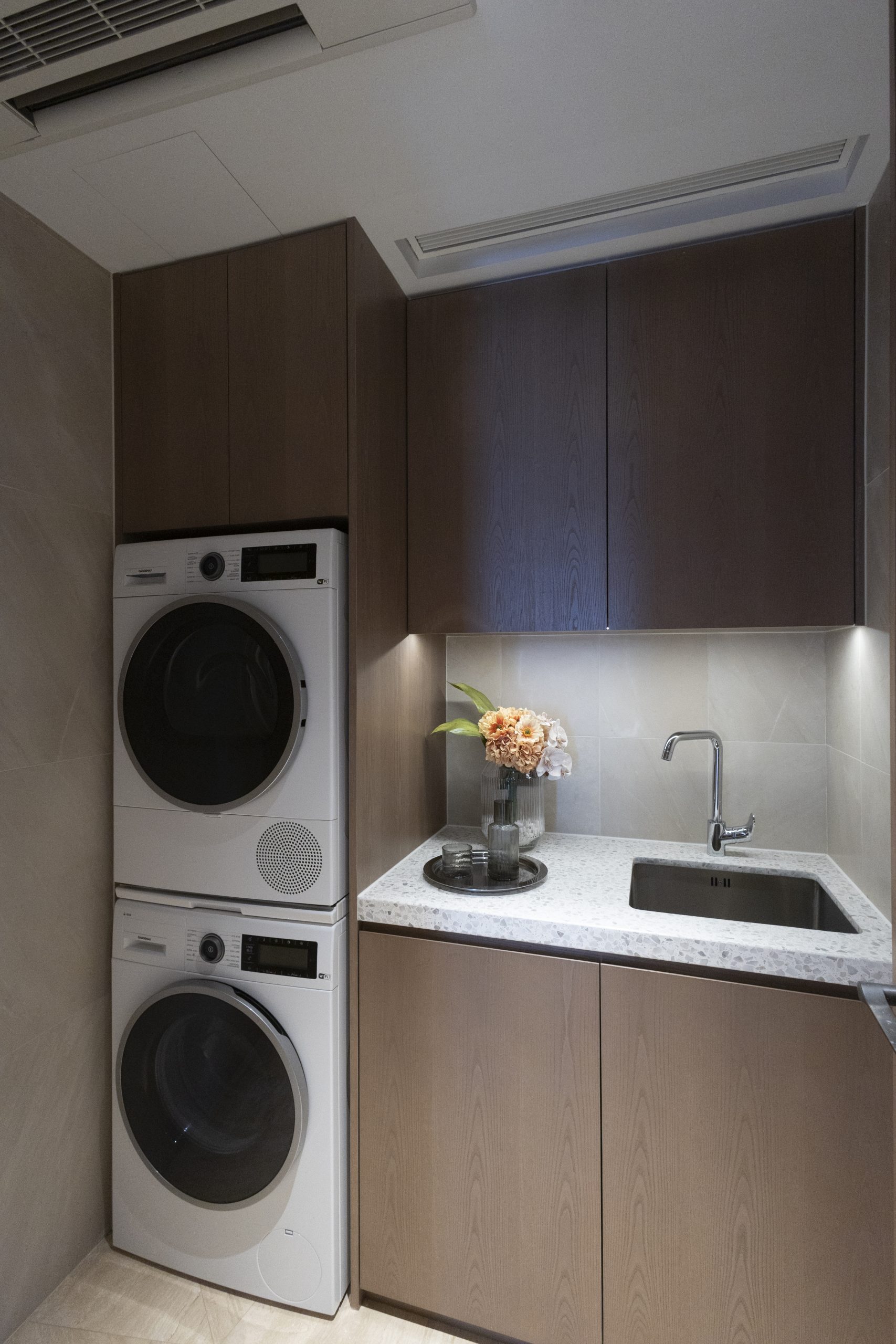 住戶駕車回家,愛驅將停泊於歐洲古堡酒窖式車庫。地庫車庫設有獨立大閘,1,526方呎闊敞停泊空間,滿足收藏名車所需。經車庫入內,左側為深咖木紋牆,地面、樓梯及右牆採用淺米黃色石灰華地板或木紋板,沿煙燻橡木圓梯蜿蜒而上,宛如穿越山林。