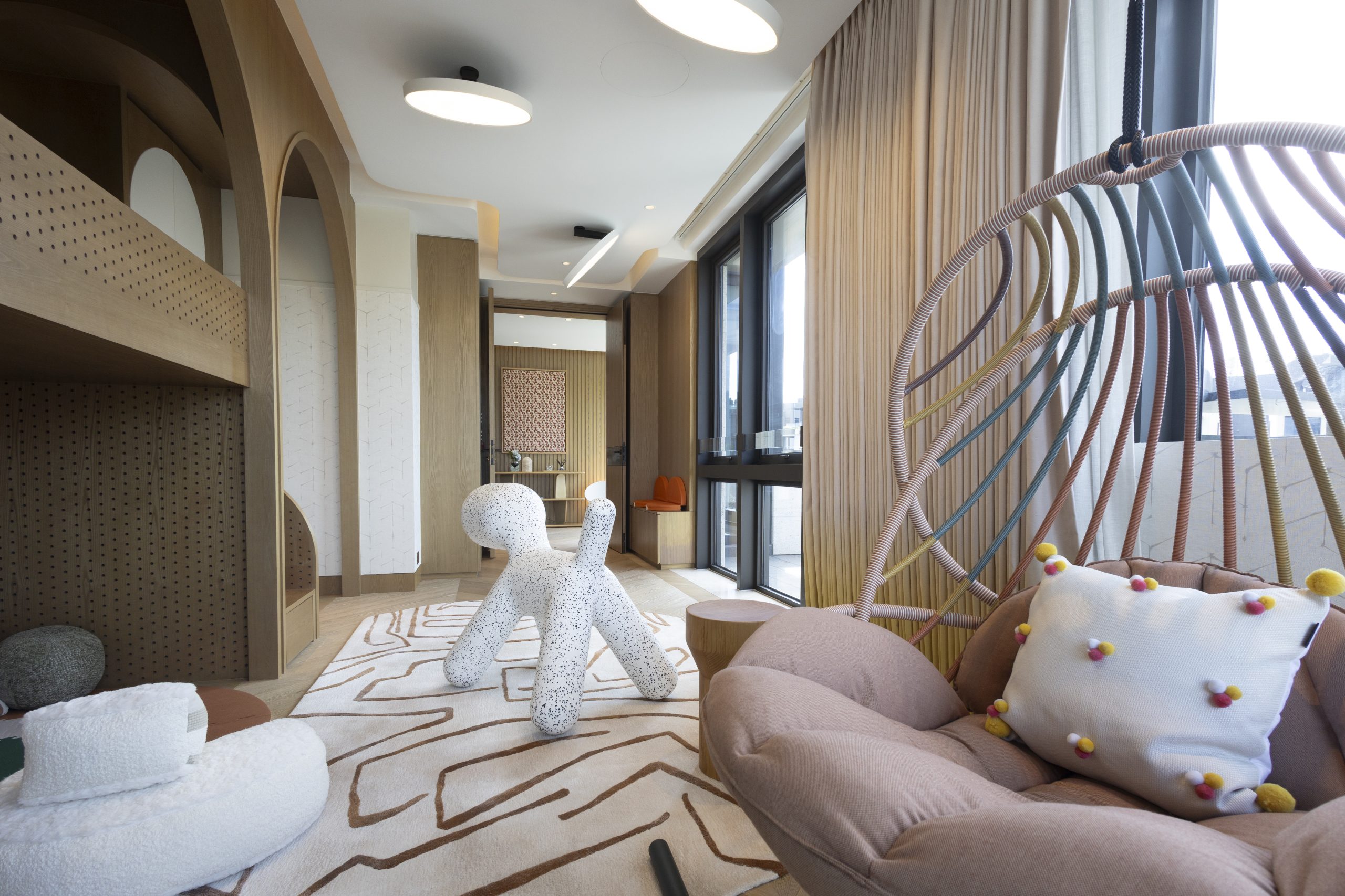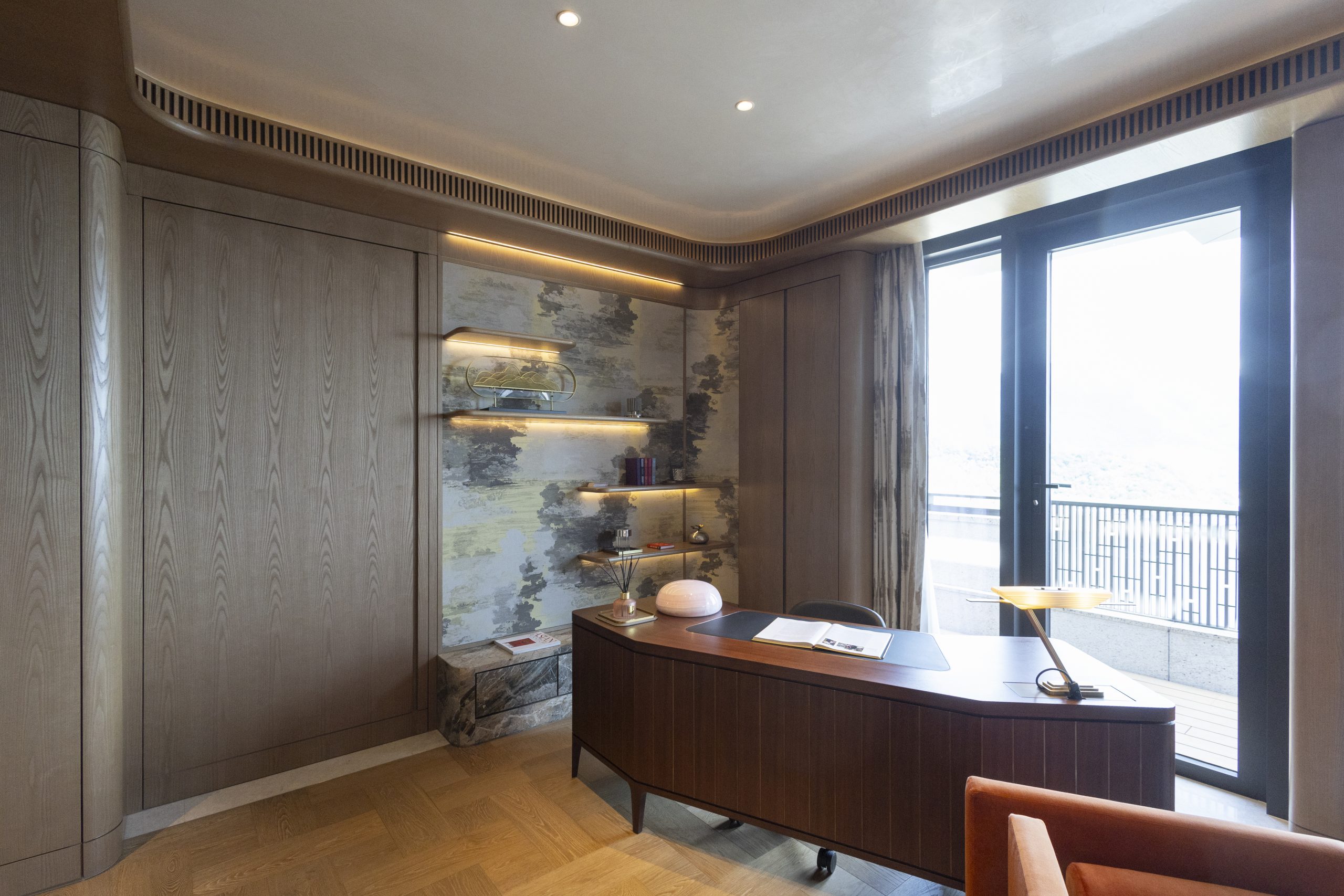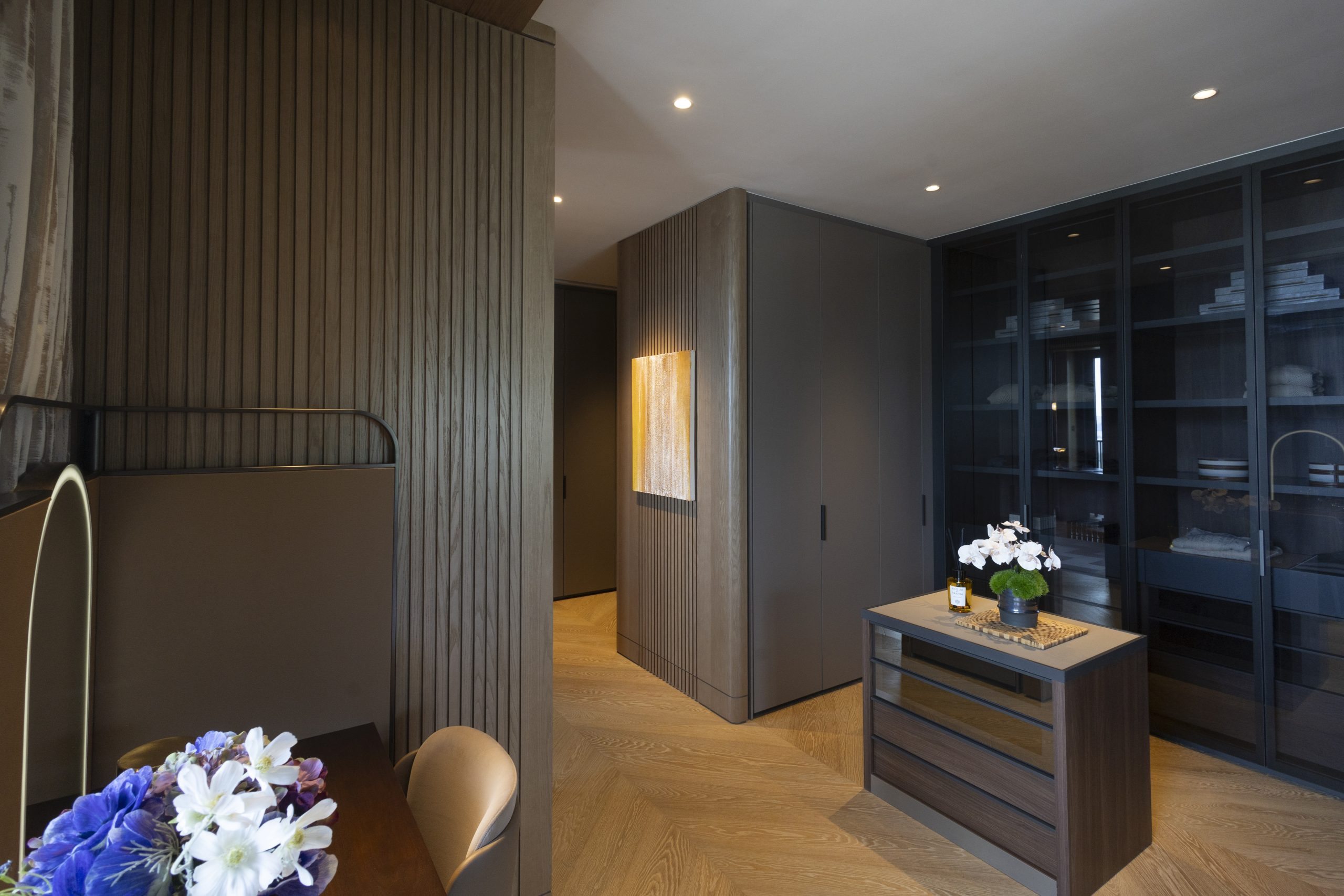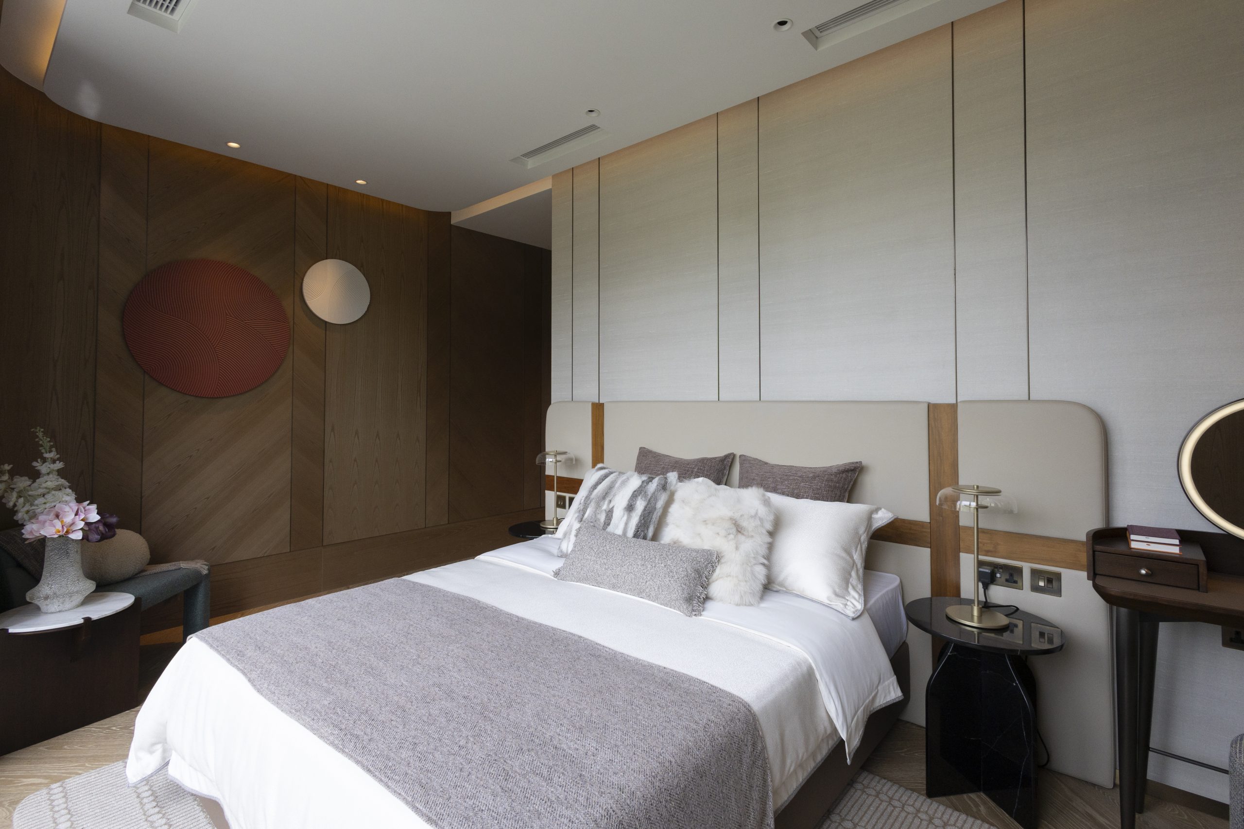 主人套房達940方呎,連近300方呎雙平台,合共逾1,200方呎,飽覽吐露港美景。門外展示了香港雕塑藝術家李展輝的不鏽鋼拋光雕塑,室內採用 亞洲風格材料與編織木地板,配Turri皮革床、TRNK扶手椅及DeMuro Das Corbu長椅,舒適雅致。主人房浴室以四川白竹大理石鋪設,細膩如水墨畫。 陽光充盈的偏廳旁為兒童臥室,設遊樂園元素與圓角家具,安全親切。達260方呎兒童臥室連近300方呎雙平台,展現流動美感。