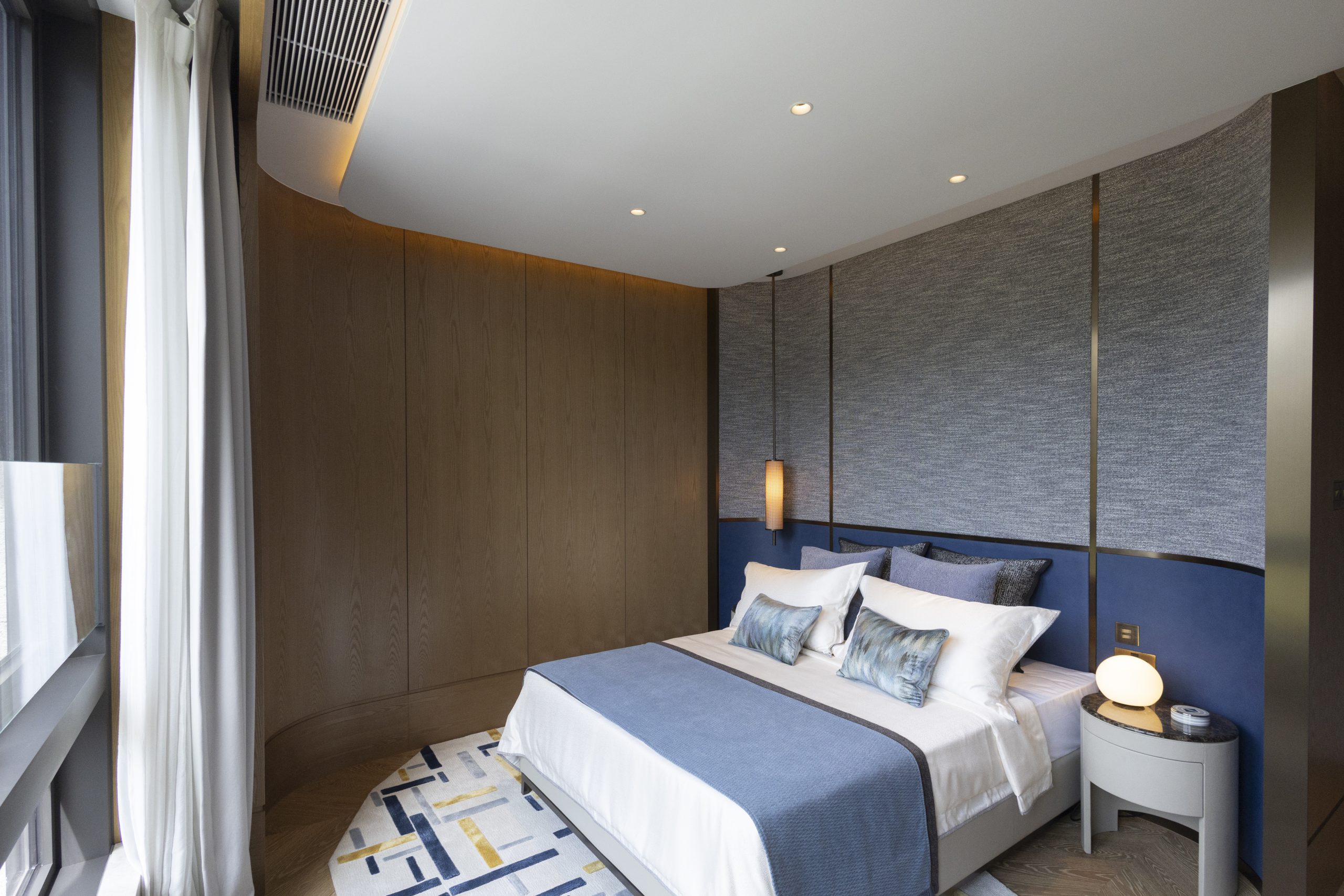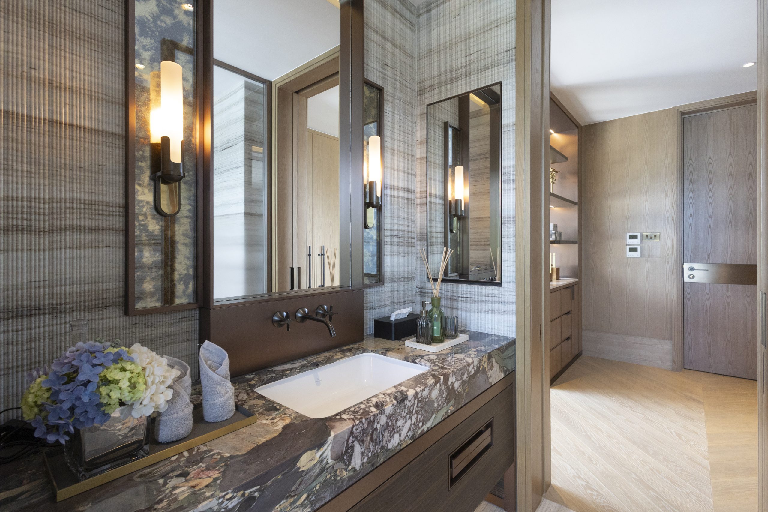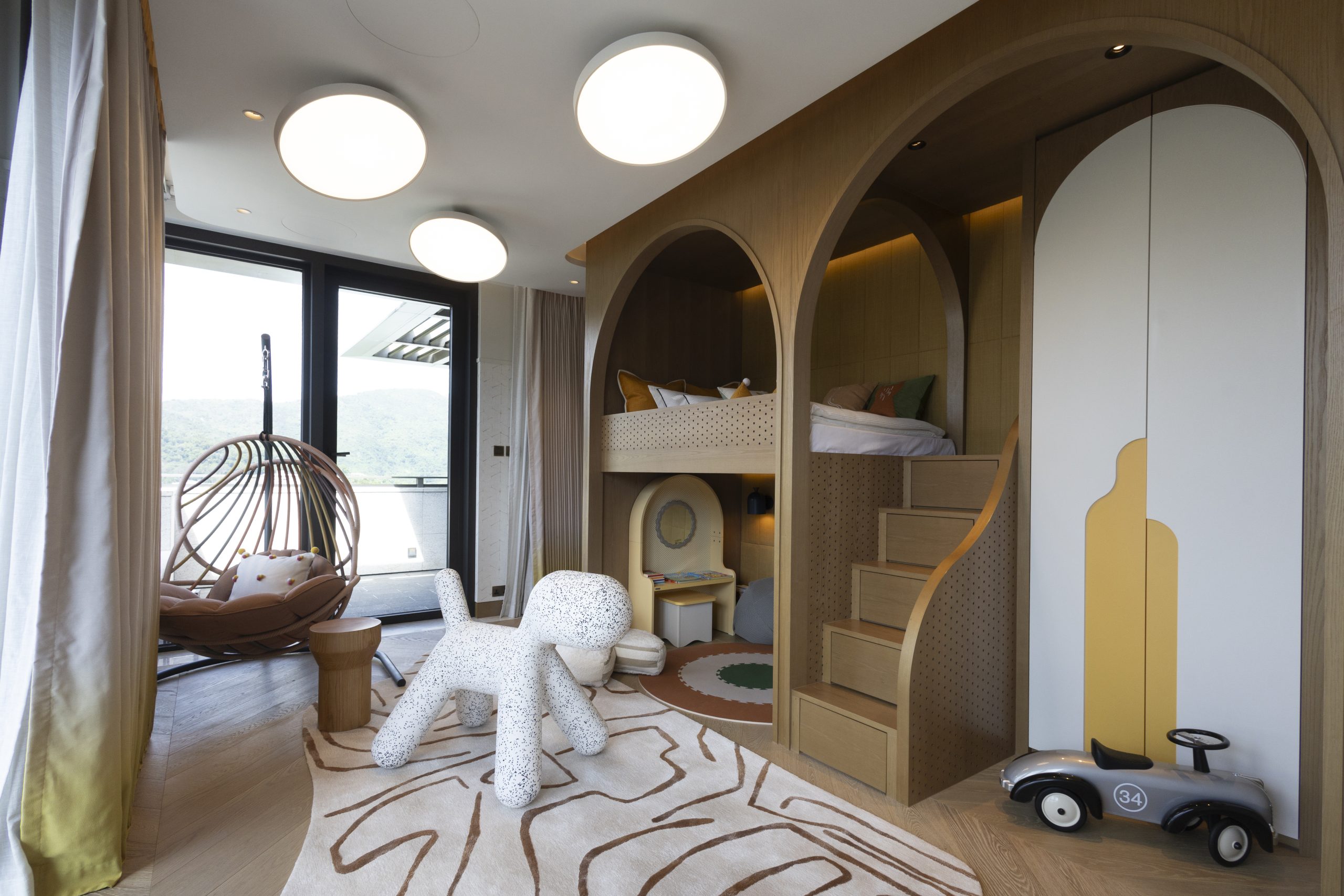 主人套房達940方呎,連近300方呎雙平台,合共逾1,200方呎,飽覽吐露港美景。門外展示了香港雕塑藝術家李展輝的不鏽鋼拋光雕塑,室內採用 亞洲風格材料與編織木地板,配Turri皮革床、TRNK扶手椅及DeMuro Das Corbu長椅,舒適雅致。主人房浴室以四川白竹大理石鋪設,細膩如水墨畫。 陽光充盈的偏廳旁為兒童臥室,設遊樂園元素與圓角家具,安全親切。達260方呎兒童臥室連近300方呎雙平台,展現流動美感。