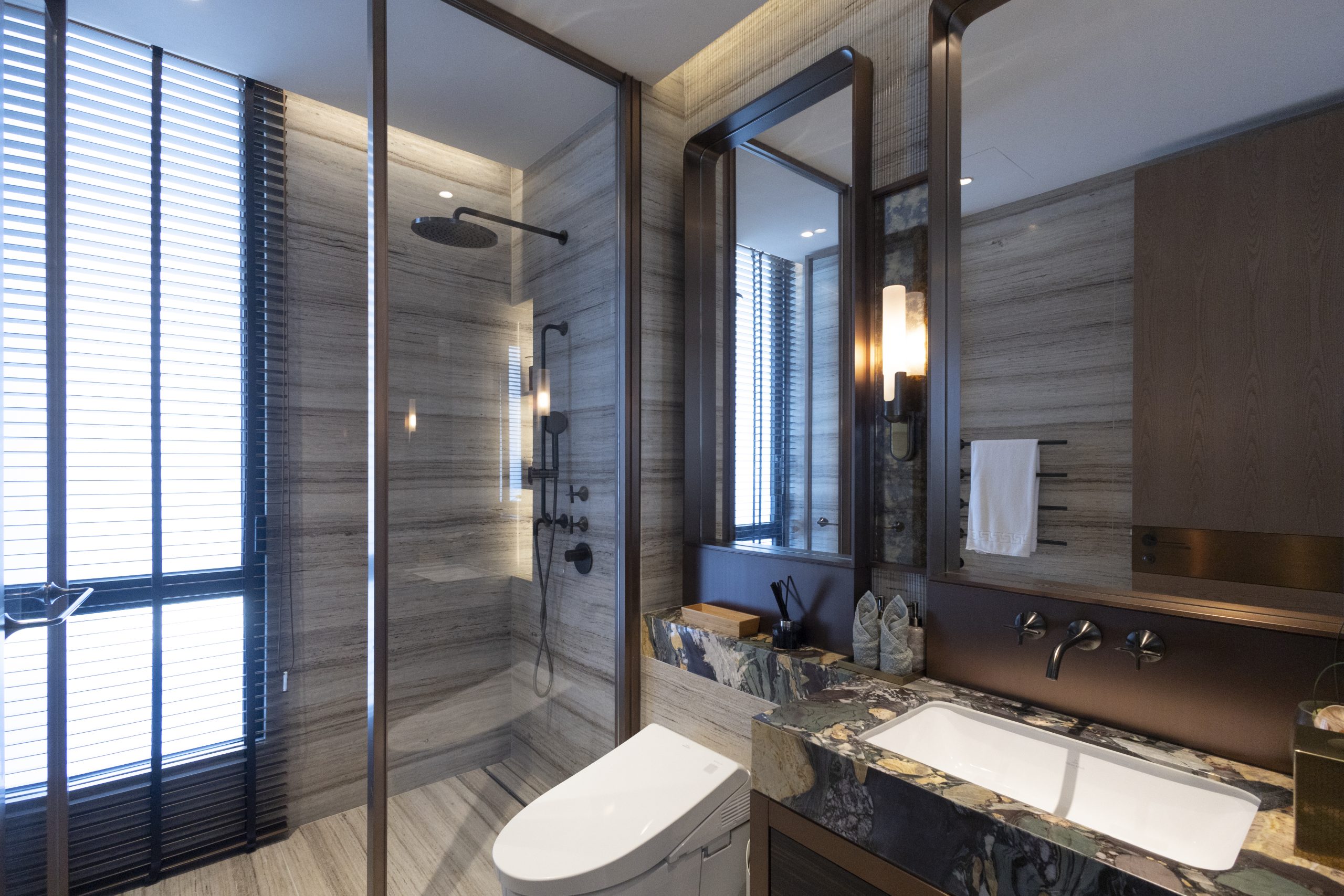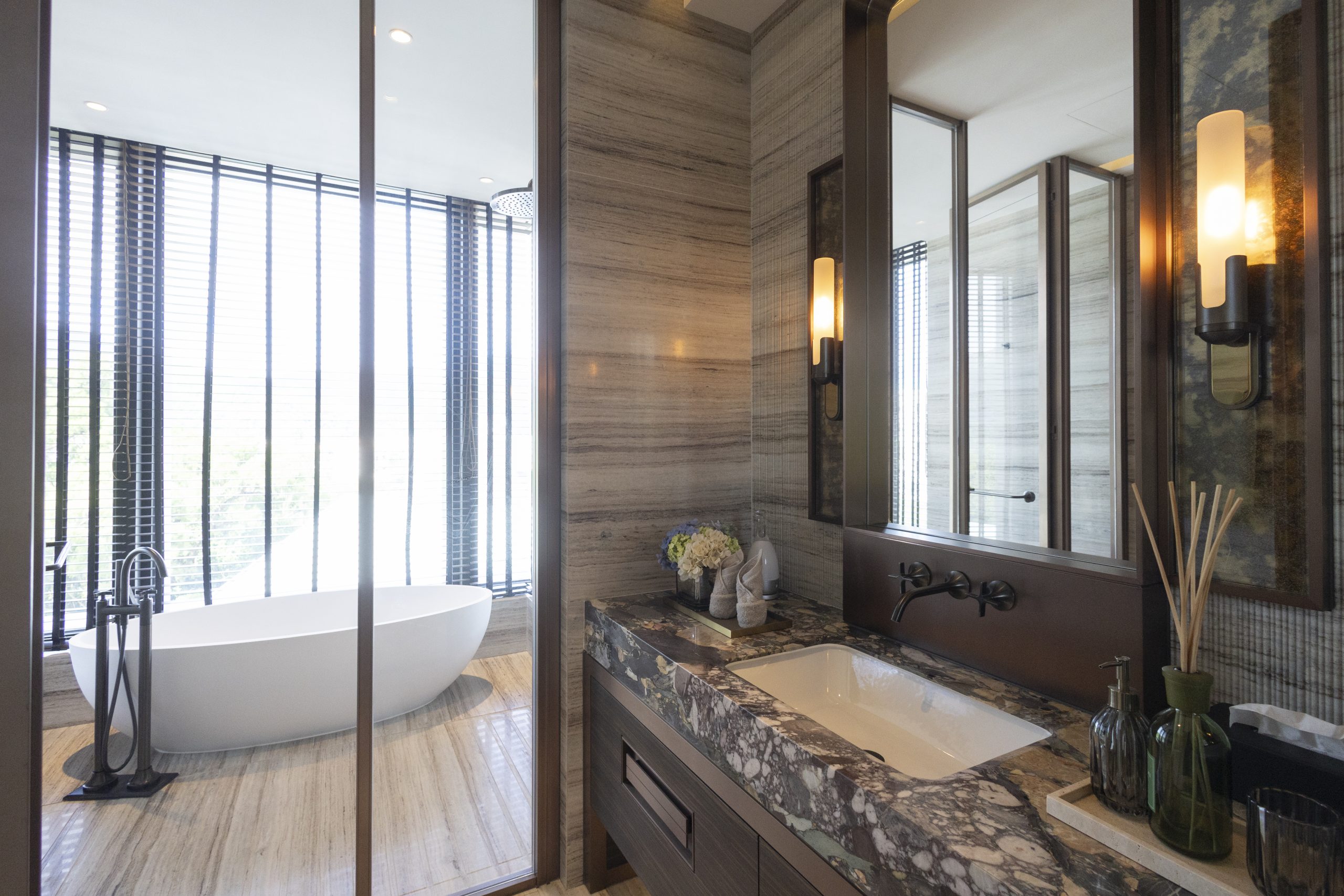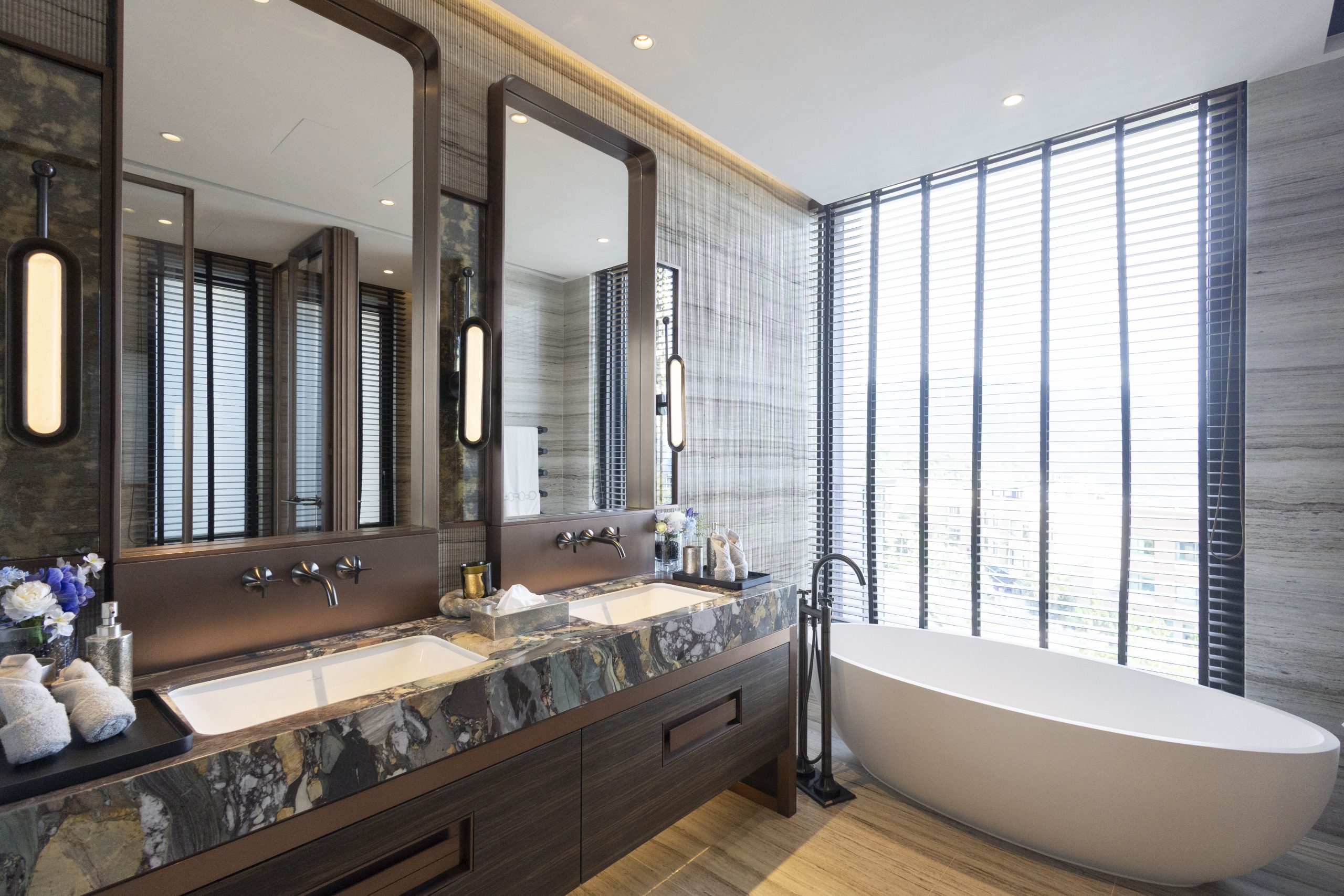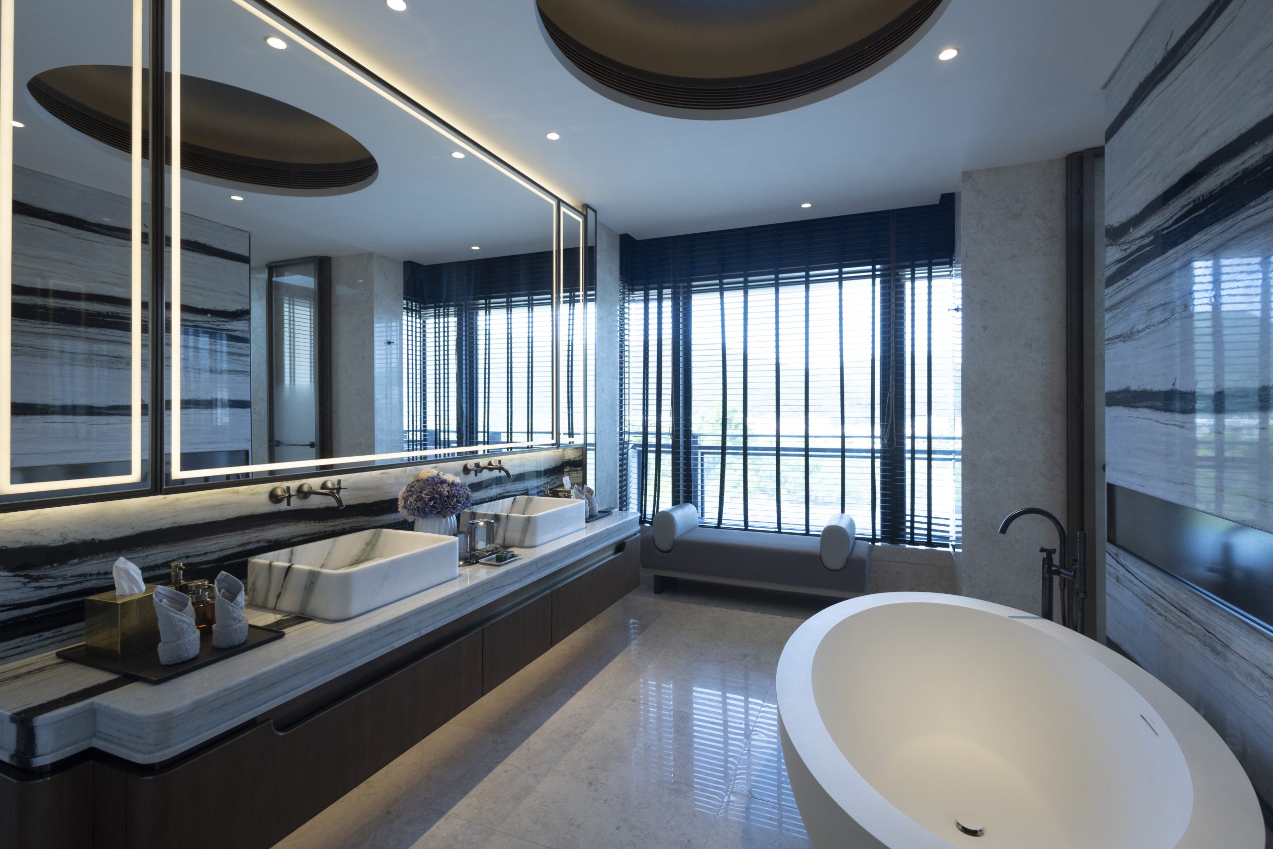 主人套房達940方呎,連近300方呎雙平台,合共逾1,200方呎,飽覽吐露港美景。門外展示了香港雕塑藝術家李展輝的不鏽鋼拋光雕塑,室內採用 亞洲風格材料與編織木地板,配Turri皮革床、TRNK扶手椅及DeMuro Das Corbu長椅,舒適雅致。主人房浴室以四川白竹大理石鋪設,細膩如水墨畫。 陽光充盈的偏廳旁為兒童臥室,設遊樂園元素與圓角家具,安全親切。達260方呎兒童臥室連近300方呎雙平台,展現流動美感。
