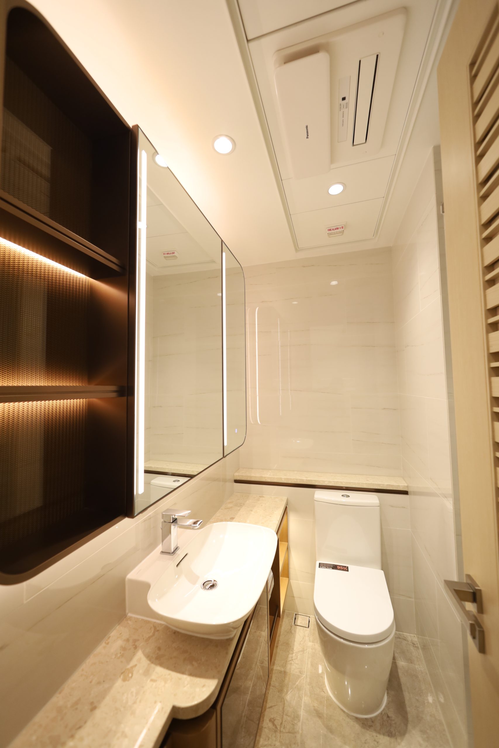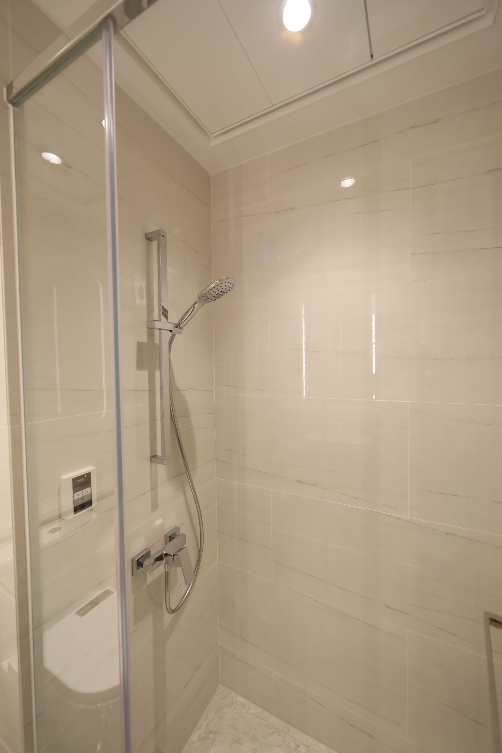 睡房同樣採用複合木地板,開則呈長方形,容易布局。住戶可善用高樓底優勢,將收納空間往上發展。單位內部分電插座配備USB Type A及Type C接口。浴室位於大門旁邊,採企缸設計。