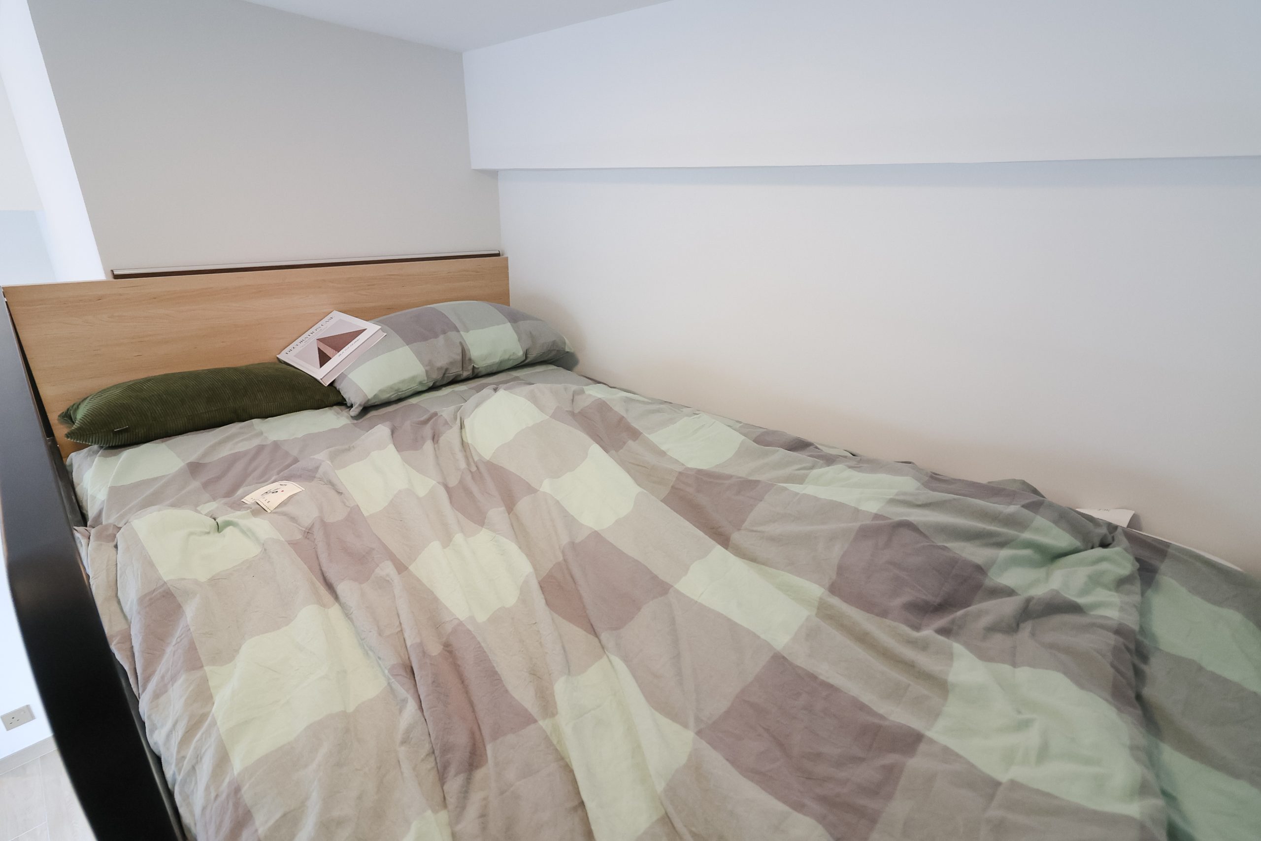 實用面積為223方呎,同樣配備22方呎露台及16方呎工作平台,遠望青蔥山巒及城市街景,猶如置身城市綠洲,生活愜意。睡眠區域長約2米、闊約1.9米,加上層與層之間高度約3.15米,設計師利用垂直空間放置多功能組合床,上層是寐區,下層是書桌及衣櫃,樓梯級亦設儲物櫃桶,令居室實用美觀兼備,提升整體居住體驗。浴室採用「明廁」設計,提升自然光滲透及空氣流通。配備高端品牌設備,設計簡約時尚,功能齊備,營造理想居住氛圍。