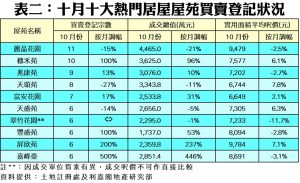 如按屋苑細分(見表二),十月份九龍灣麗晶花園按月登記宗數以11宗買賣登記佔據上月熱門居屋屋苑榜首,惟登記宗數較上月少2宗;而火炭穗禾苑以10宗買賣登記佔據上月熱門居屋屋苑亞軍,其餘上榜屋苑則錄得介乎6至9宗買賣登記。值得一提的是牛池灣嘉峰臺及天水圍屏欣苑上月的登記量均為6宗,分別急飆5倍及2倍成上月升幅較大的居屋屋苑;上述兩個屋苑的成交總額亦分別大升4.46倍及2.37倍,涉資各達約2,851萬及2,360萬元。